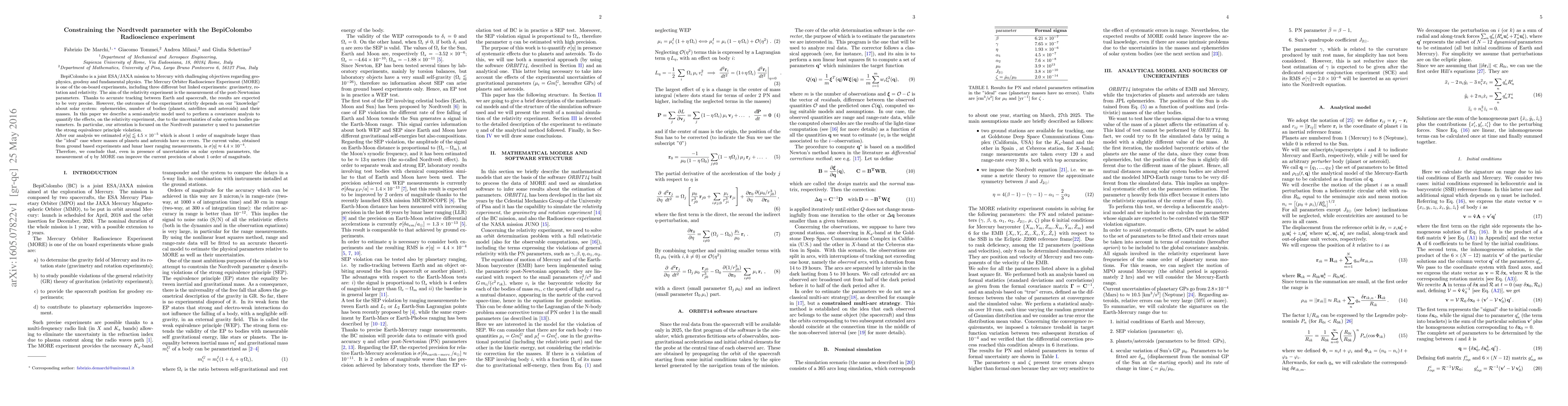 BepiColombo is a joint ESA/JAXA mission to Mercury with challenging objectives regarding geophysics, geodesy and fundamental physics. The Mercury Orbiter Radioscience Experiment (MORE) is one of the on-board experiments, including three different but linked experiments: gravimetry, rotation and relativity. The aim of the relativity experiment is the measurement of the post-Newtonian parameters. Thanks to accurate tracking between Earth and spacecraft, the results are expected to be very precise. However, the outcomes of the experiment strictly depends on our "knowledge" about solar system: ephemerides, number of bodies (planets, satellites and asteroids) and their masses. In this paper we describe a semi-analytic model used to perform a covariance analysis to quantify the effects, on the relativity experiment, due to the uncertainties of solar system bodies parameters. In particular, our attention is focused on the Nordtvedt parameter $\eta$ used to parametrize the strong equivalence principle violation. After our analysis we estimated $\sigma[\eta]\lessapprox 4.5\times 10^{-5}$ which is about 1~order of magnitude larger than the "ideal" case where masses of planets and asteroids have no errors. The current value, obtained from ground based experiments and lunar laser ranging measurements, is $\sigma[\eta]\approx 4.4\times 10^{-4}$. Therefore, we conclude that, even in presence of uncertainties on solar system parameters, the measurement of $\eta$ by MORE can improve the current precision of about 1~order of magnitude.
