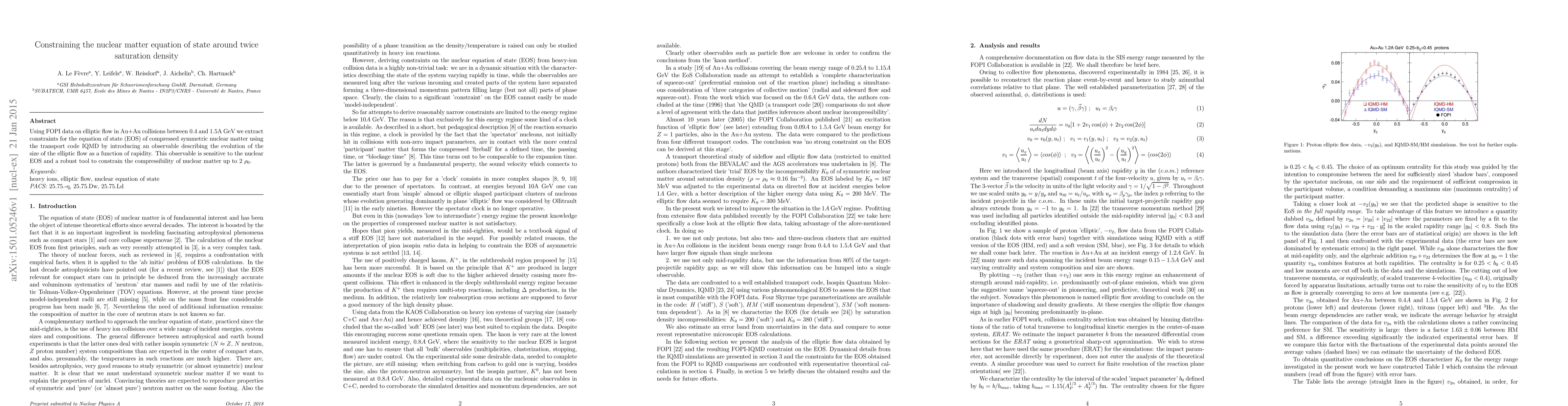 This study uses FOPI data on elliptic flow in Au+Au collisions to constrain the nuclear matter equation of state up to twice the saturation density, employing the IQMD transport code and a novel observable related to the size of elliptic flow as a function of rapidity. The findings provide insights into the compressibility of nuclear matter at high densities.