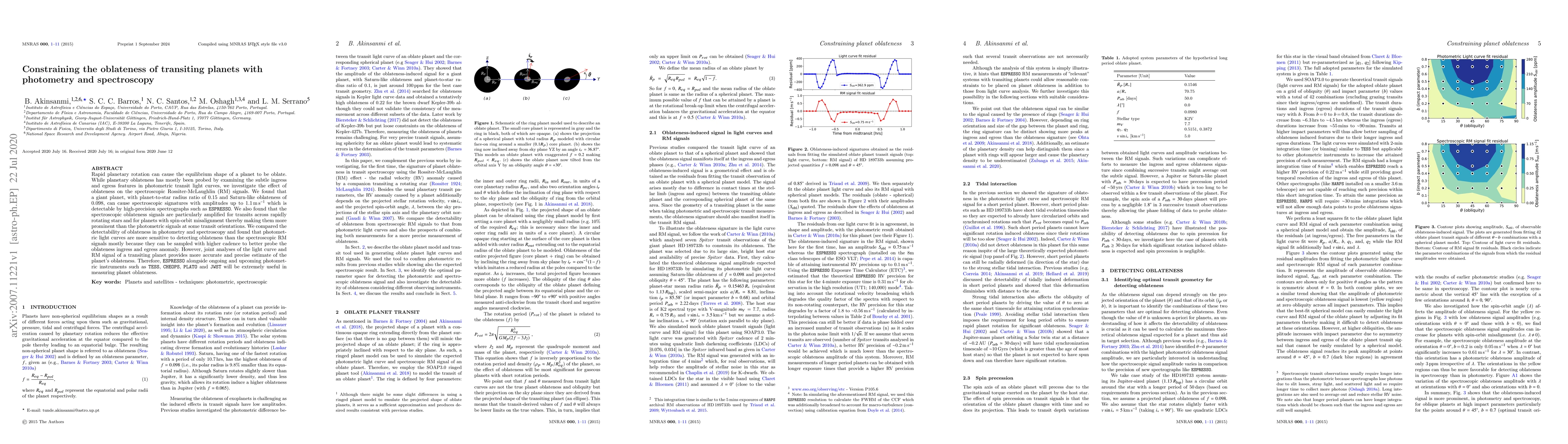 This study investigates the oblateness of transiting planets using both photometric transit light curves and spectroscopic Rossiter-McLaughlin signals, finding that spectroscopic signals can detect oblateness, especially for rapidly rotating stars and misaligned planets. Joint analysis of both data types provides the most accurate oblateness estimates.