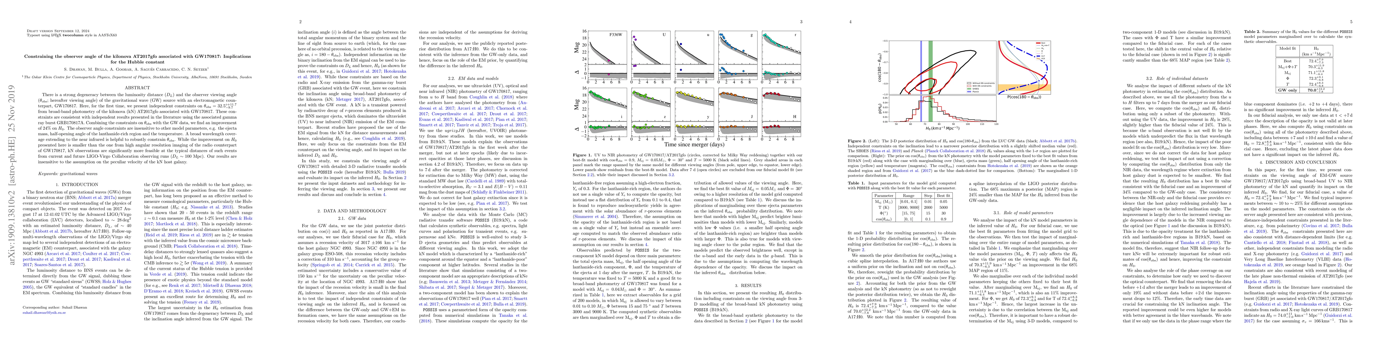 There is a strong degeneracy between the luminosity distance ($D_L$) and the observer viewing angle ($\theta_{\rm obs}$; hereafter viewing angle) of the gravitational wave (GW) source with an electromagnetic counterpart, GW170817. Here, for the first time, we present independent constraints on $\theta_{\rm obs} = 32.5 ^{\circ +11.7}_{-9.7}$ from broad-band photometry of the kilonova (kN) AT2017gfo associated with GW170817. These constraints are consistent with independent results presented in the literature using the associated gamma ray burst GRB170817A. Combining the constraints on $\theta_{\rm obs}$ with the GW data, we find an improvement of 24$\%$ on $H_0$. The observer angle constraints are insensitive to other model parameters, e.g. the ejecta mass, half-opening angle of the lanthanide-rich region and the temperature. A broad wavelength coverage extending to the near infrared is helpful to robustly constrain $\theta_{\rm obs}$. While the improvement on $H_0$ presented here is smaller than the one from high angular resolution imaging of the radio counterpart of GW170817, kN observations are significantly more feasible at the typical distances of such events from current and future LIGO-Virgo Collaboration observing runs ($D_L \sim 100$ Mpc). Our results are insensitive to the assumption on the peculiar velocity of the kN host galaxy.