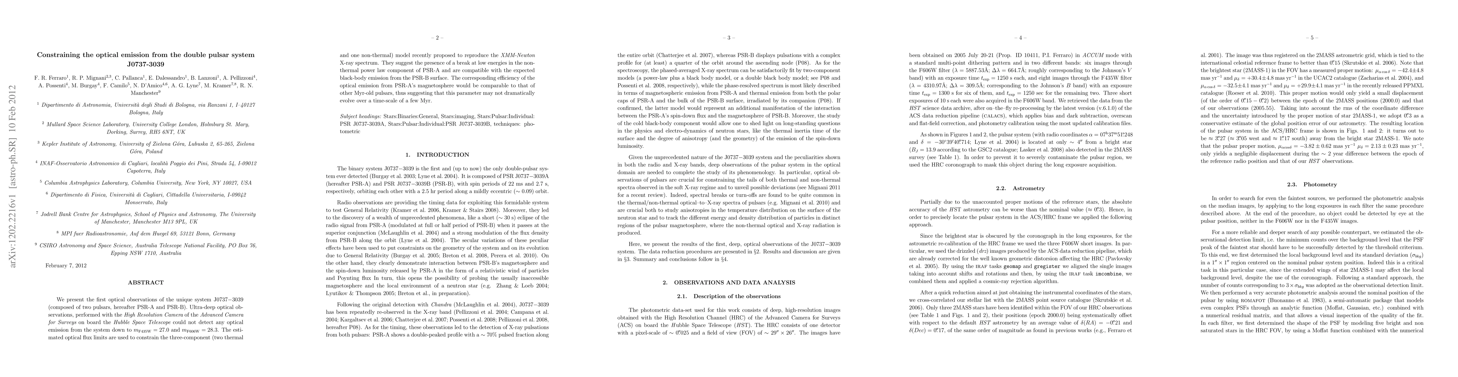 This study presents the first optical observations of the double pulsar system J0737-3039 using the Hubble Space Telescope, which found no detectable optical emission, providing constraints on a three-component model of the system's X-ray spectrum and suggesting stable optical emission efficiency over millions of years.
