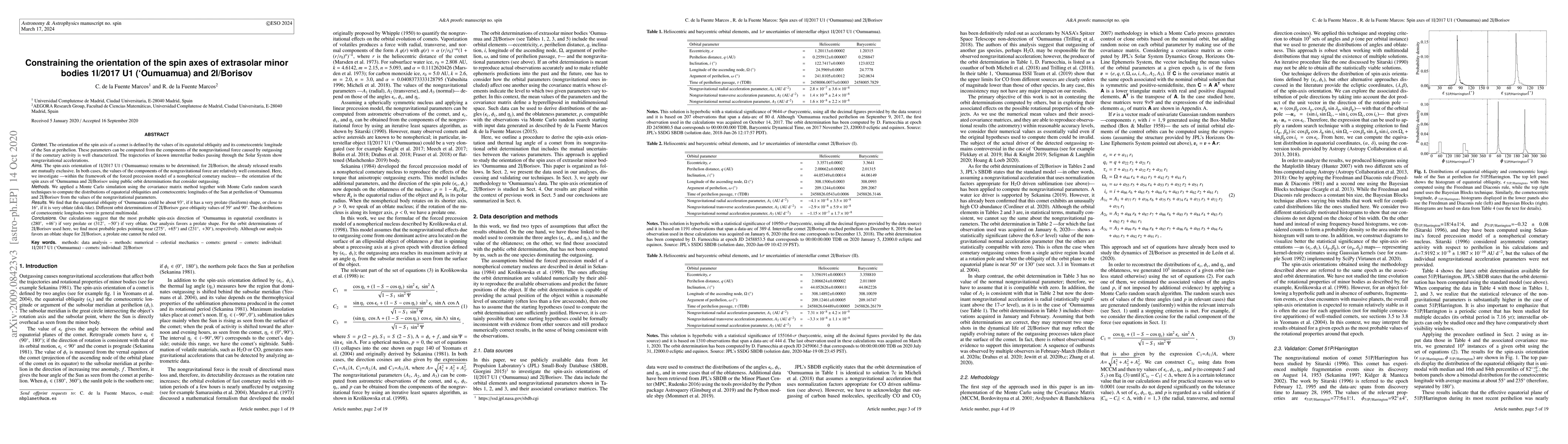 Context. The orientation of the spin axis of a comet is defined by the values of its equatorial obliquity and its cometocentric longitude of the Sun. These parameters can be computed from the components of the nongravitational force caused by outgassing, if the cometary activity is well characterized. The trajectories of known interstellar bodies passing through the Solar System show nongravitational accelerations. Aims. The spin-axis orientation of 1I/2017 U1 (`Oumuamua) remains to be determined; for 2I/Borisov, the already released results are mutually exclusive. Here, we investigate the orientation of the spin axes of `Oumuamua and 2I/Borisov using public orbit determinations that consider outgassing. Methods. We applied a Monte Carlo simulation using the covariance matrix method together with Monte Carlo random search techniques to compute the distributions of equatorial obliquities and cometocentric longitudes of the Sun at perihelion of `Oumuamua and 2I/Borisov from the values of the nongravitational parameters. Results. We find that the equatorial obliquity of `Oumuamua could be about 93 deg, if it has a very prolate (fusiform) shape, or close to 16 deg, if it is very oblate (disk-like). Different orbit determinations of 2I/Borisov gave obliquity values of 59 deg and 90 deg. The distributions of cometocentric longitudes were in general multimodal. Conclusions. The most probable spin-axis direction of `Oumuamua in equatorial coordinates is (280 degrees, +46 degrees) if very prolate or (312 deg, -50 deg) if very oblate. For the orbit determinations of 2I/Borisov used here, we find most probable poles pointing near (275 deg, +65 deg) and (231 deg, +30 deg), respectively. Although our analysis favors an oblate shape for 2I/Borisov, a prolate one cannot be ruled out.