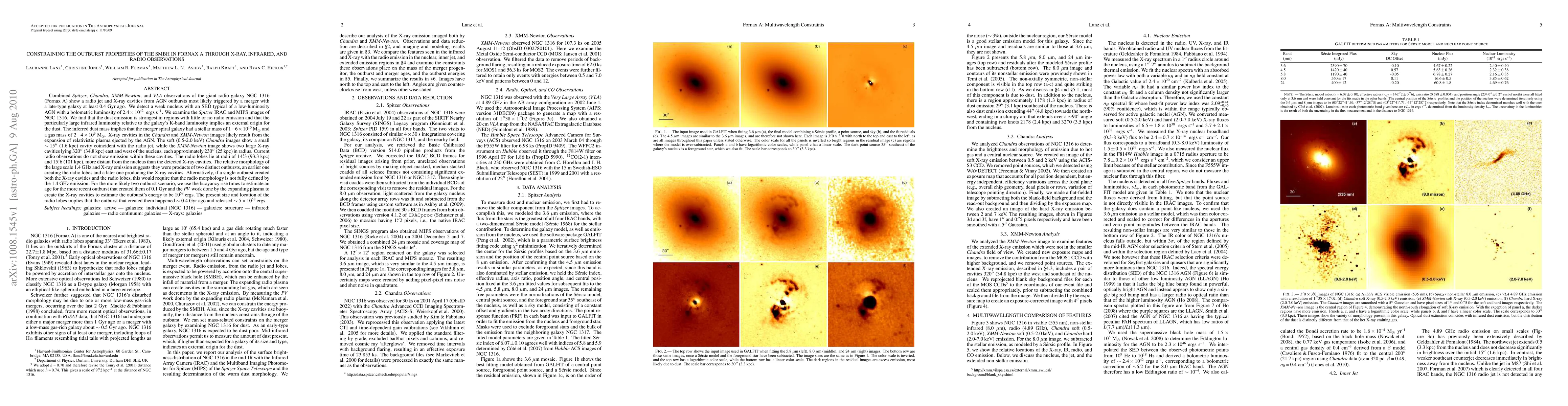 Combined Spitzer, Chandra, XMM-Newton, and VLA observations of the giant radio galaxy NGC 1316 (Fornax A) show a radio jet and X-ray cavities from AGN outbursts likely triggered by a merger with a late-type galaxy at least 0.4 Gyr ago. We detect a weak nucleus with an SED typical of a low-luminosity AGN with a bolometric luminosity of 2.4x10^42 erg/s. The Spitzer IRAC and MIPS images show dust emission strongest in regions with little or no radio emission. The large infrared luminosity relative to the galaxy's K-band luminosity implies an external origin for the dust. The dust mass implies that the merger spiral galaxy had a stellar mass of 1-6x10^10 M_sun and a gas mass of 2-4x10^9 M_sun. Chandra images show a small ~15"(1.6 kpc) cavity coincident with the radio jet, while the XMM-Newton image shows two large X-ray cavities lying 320"(34.8 kpc) east and west of the nucleus, each approximately 230"(25 kpc) in radius. The radio lobes lie at radii of 14.3'(93 kpc) and 15.6'(101 kcp), more distant from the nucleus than the detected X-ray cavities. The relative morphology of the large scale 1.4 GHz and X-ray emission suggests they were products of two distinct outbursts, an earlier one creating the radio lobes and a later one producing the X-ray cavities. Alternatively, if a single outburst created both the X-ray cavities and the radio lobes, this would require that the morphology is not fully defined by the 1.4 GHz emission. For the more likely two outburst scenario, we use the buoyancy rise times to estimate an age for the more recent outburst of 0.1 Gyr and use the associated PV work done by the expanding plasma to create the X-ray cavities to estimate the outburst's energy of 10^58 ergs. The present size and location of the large radio lobes implies that the AGN outburst that created them happened ~0.4 Gyr ago and released ~5x10^58 ergs. (abridged)