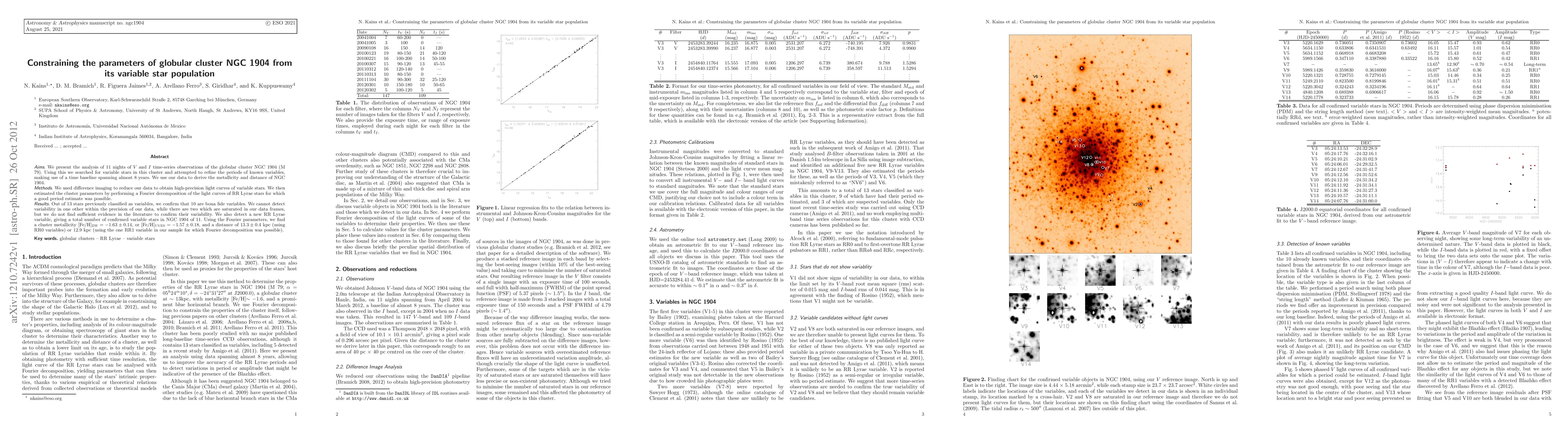 We present the analysis of 11 nights of V and I time-series observations of the globular cluster NGC 1904 (M 79). Using this we searched for variable stars in this cluster and attempted to refine the periods of known variables, making use of a time baseline spanning almost 8 years. We use our data to derive the metallicity and distance of NGC 1904. We used difference imaging to reduce our data to obtain high-precision light curves of variable stars. We then estimated the cluster parameters by performing a Fourier decomposition of the light curves of RR Lyrae stars for which a good period estimate was possible. We also derive an estimate for the age of the cluster by fitting theoretical isochrones to our colour-magnitude diagram (CMD). Out of 13 stars previously classified as variables, we confirm that 10 are bona fide variables. We cannot detect variability in one other within the precision of our data, while there are two which are saturated in our data frames, but we do not find sufficient evidence in the literature to confirm their variability. We also detect a new RR Lyrae variable, giving a total number of confirmed variable stars in NGC 1904 of 11. Using the Fourier parameters, we find a cluster metallicity [Fe/H]_ZW=-1.63 +- 0.14, or [Fe/H]_UVES=-1.57 \pm 0.18, and a distance of 13.3 +- 0.4 kpc (using RR0 variables) or 12.9 kpc (using the one RR1 variable in our sample for which Fourier decomposition was possible).