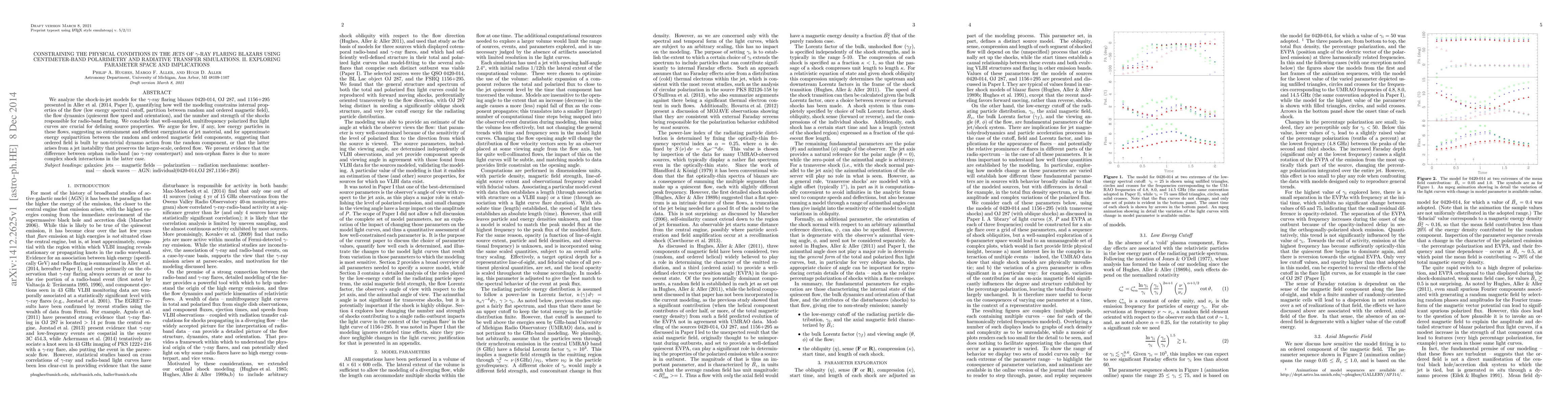 We analyze the shock-in-jet models for the gamma-ray flaring blazars 0420-014, OJ 287, and 1156+295 presented in Aller et al. (2014, Paper I), quantifying how well the modeling constrains internal properties of the flow (low energy spectral cutoff, partition between random and ordered magnetic field), the flow dynamics (quiescent flow speed and orientation), and the number and strength of the shocks responsible for radio-band flaring. We conclude that well-sampled, multifrequency polarized flux light curves are crucial for defining source properties. We argue for few, if any, low energy particles in these flows, suggesting no entrainment and efficient energization of jet material, and for approximate energy equipartition between the random and ordered magnetic field components, suggesting that ordered field is built by non-trivial dynamo action from the random component, or that the latter arises from a jet instability that preserves the larger-scale, ordered flow. We present evidence that the difference between orphan radio-band (no gamma-ray counterpart) and non-orphan flares is due to more complex shock interactions in the latter case.