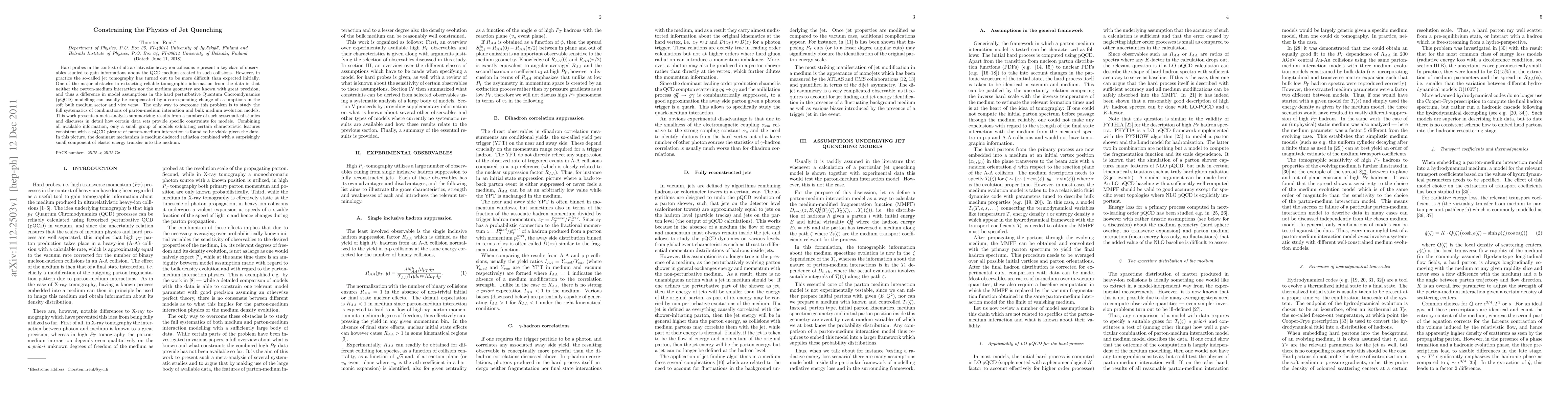 Hard probes in the context of ultrarelativistic heavy ion collisions represent a key class of observables studied to gain informations about the QCD medium created in such collisions. However, in practice the so-called jet tomography has turned out to be more difficult than expected initially. One of the major obstacles in extracting reliable tomographic information from the data is that neither the parton-medium interaction nor the medium geometry are known with great precision, and thus a difference in model assumptions in the hard perturbative Quantum Choromdynamics (pQCD) modelling can usually be compensated by a corresponding change of assumptions in the soft bulk medium sector and vice versa. The only way to overcome this problem is to study the full systematics of combinations of parton-medium interaction and bulk medium evolution models. This work presents a meta-analysis summarizing results from a number of such systematical studies and discusses in detail how certain data sets provide specific constraints for models. Combining all available information, only a small group of models exhibiting certain characteristic features consistent with a pQCD picture of parton-medium interaction is found to be viable given the data. In this picture, the dominant mechanism is medium-induced radiation combined with a surprisingly small component of elastic energy transfer into the medium.