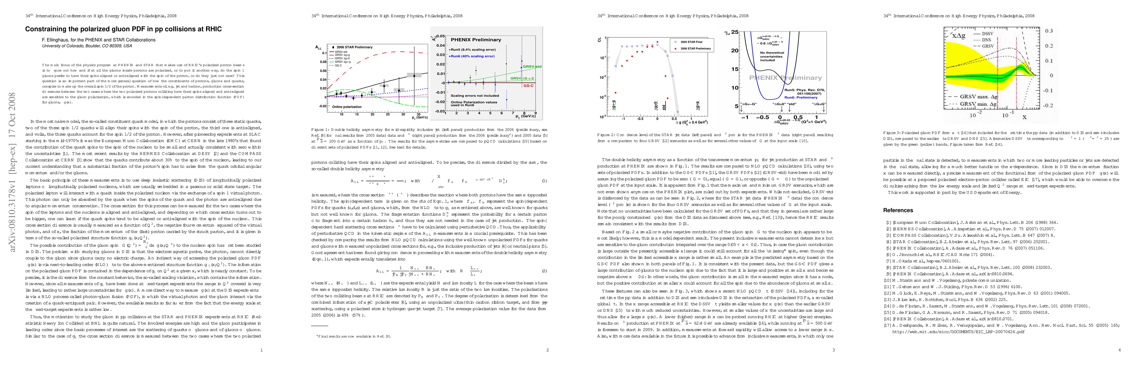 The main focus of the physics program at PHENIX and STAR that makes use of RHIC's polarized proton beams is to figure out how and if at all the gluons inside protons are polarized, or to put it another way, do the spin 1 gluons prefer to have their spins aligned or anti-aligned with the spin of the proton, or do they just not care? This question is an important part of the more general question of how the constituents of protons, gluons and quarks, conspire to make up the overall spin 1/2 of the proton. Measurements of, e.g, jet and hadron, production cross-section differences between the two cases where the two polarized protons colliding have their spins aligned and anti-aligned are sensitive to the gluon polarization, which is encoded in the spin--dependent parton distribution function (PDF) for gluons, Delta-g(x).