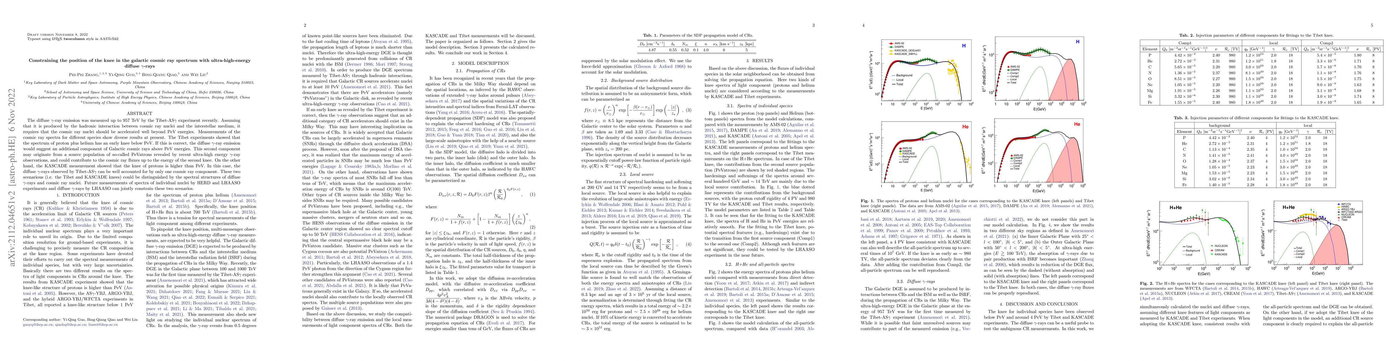 The diffuse $\gamma$-ray emission was measured up to $957$ TeV by the Tibet-AS$\gamma$ experiment recently. Assuming that it is produced by the hadronic interaction between cosmic ray nuclei and the interstellar medium, it requires that the cosmic ray nuclei should be accelerated well beyond PeV energies. Measurements of the cosmic ray spectra for different species show diverse results at present. The Tibet experiments showed that the spectrum of proton plus helium has an early knee below PeV. If this is correct, the diffuse $\gamma$-ray emission would suggest an additional component of Galactic cosmic rays above PeV energies. This second component may originate from a source population of so-called PeVatrons revealed by recent ultra-high energy $\gamma$-ray observations, and could contribute to the cosmic ray fluxes up to the energy of the second knee. On the other hand, the KASCADE measurement showed that the knee of protons is higher than PeV. In this case, the diffuse $\gamma$-rays observed by Tibet-AS$\gamma$ can be well accounted for by only one cosmic ray component. These two scenarious (ie. the Tibet and KASCADE knees) could be distinguished by the spectral structures of diffuse $\gamma$-rays and cosmic ray nuclei. Future measurements of spectra of individual nuclei by HERD and LHAASO experiments and diffuse $\gamma$-rays by LHAASO can jointly constrain these two scenarios.