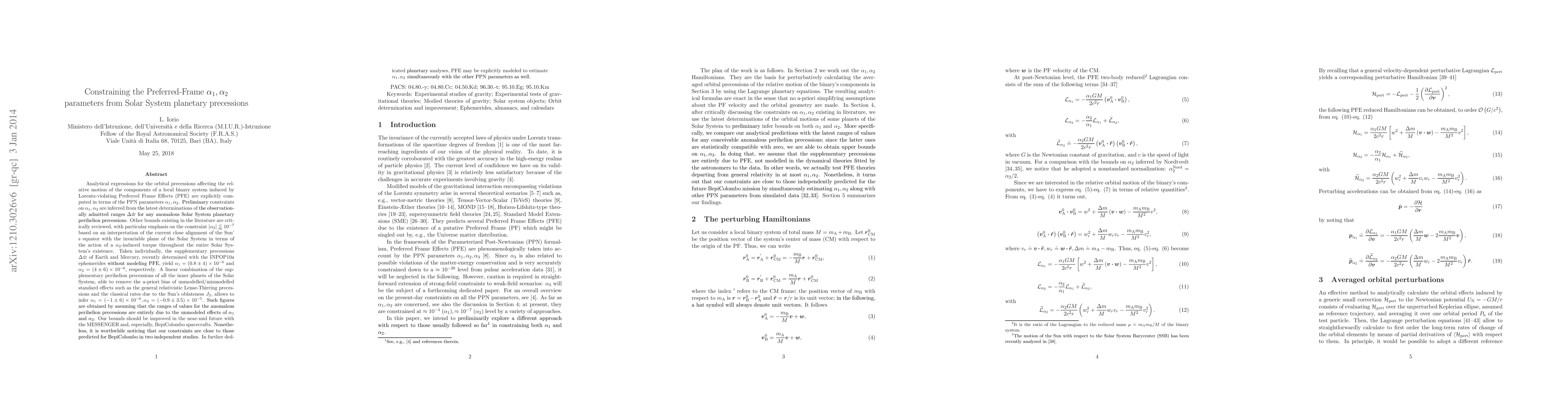 This paper constrains the Lorentz-violating Preferred Frame Effects parameters $\alpha_1$ and $\alpha_2$ by analyzing the orbital precessions of Solar System planets, achieving bounds of $|\alpha_1| \leq 6\times 10^{-6}$ and $|\alpha_2| \leq 3.5\times 10^{-5}$. Future improvements are expected from the MESSENGER and BepiColombo missions.