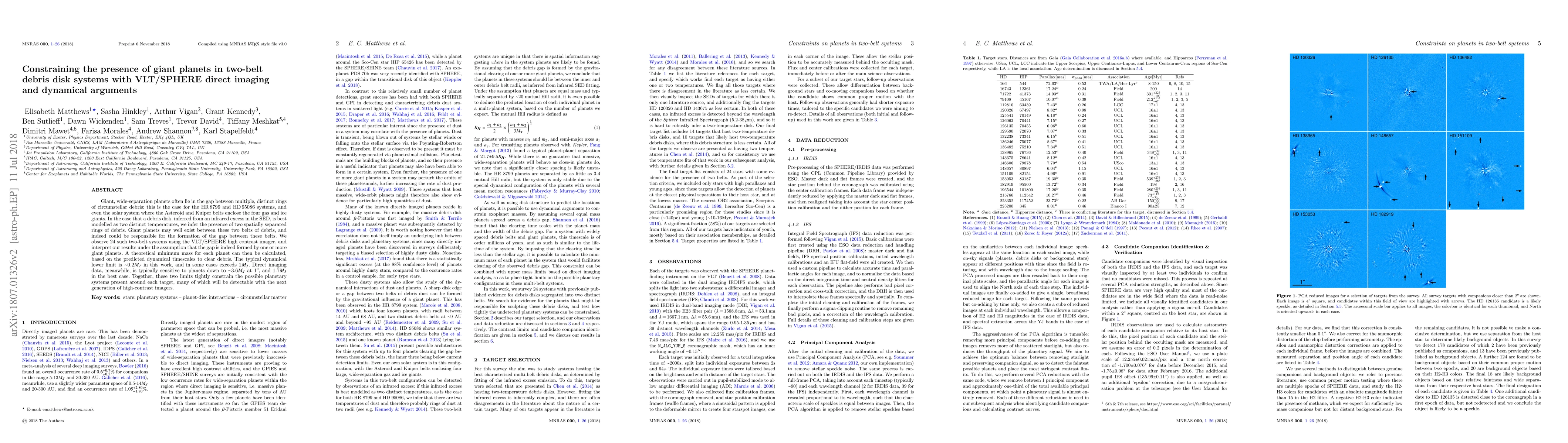 Giant, wide-separation planets often lie in the gap between multiple, distinct rings of circumstellar debris: this is the case for the HR\,8799 and HD\,95086 systems, and even the solar system where the Asteroid and Kuiper belts enclose the four gas and ice giants. In the case that a debris disk, inferred from an infrared excess in the SED, is best modelled as two distinct temperatures, we infer the presence of two spatially separated rings of debris. Giant planets may well exist between these two belts of debris, and indeed could be responsible for the formation of the gap between these belts. We observe 24 such two-belt systems using the VLT/SPHERE high contrast imager, and interpret our results under the assumption that the gap is indeed formed by one or more giant planets. A theoretical minimum mass for each planet can then be calculated, based on the predicted dynamical timescales to clear debris. The typical dynamical lower limit is $\sim$0.2$M_J$ in this work, and in some cases exceeds 1$M_J$. Direct imaging data, meanwhile, is typically sensitive to planets down to $\sim$3.6$M_J$ at 1'', and 1.7$M_J$ in the best case. Together, these two limits tightly constrain the possible planetary systems present around each target, many of which will be detectable with the next generation of high-contrast imagers.