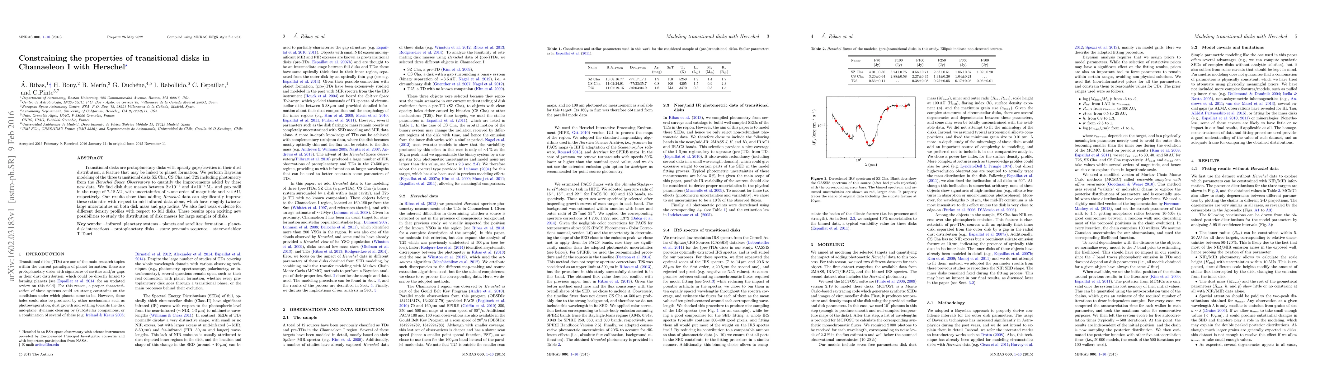 This study uses Herschel Space Observatory data to model three transitional disks in Chamaeleon I, finding dust masses between 2x10^-5 and 4x10^-4 Msun and gap radii of 7-18 AU. Herschel data significantly improve estimates over mid-infrared data, reducing uncertainties and suggesting different density profiles.