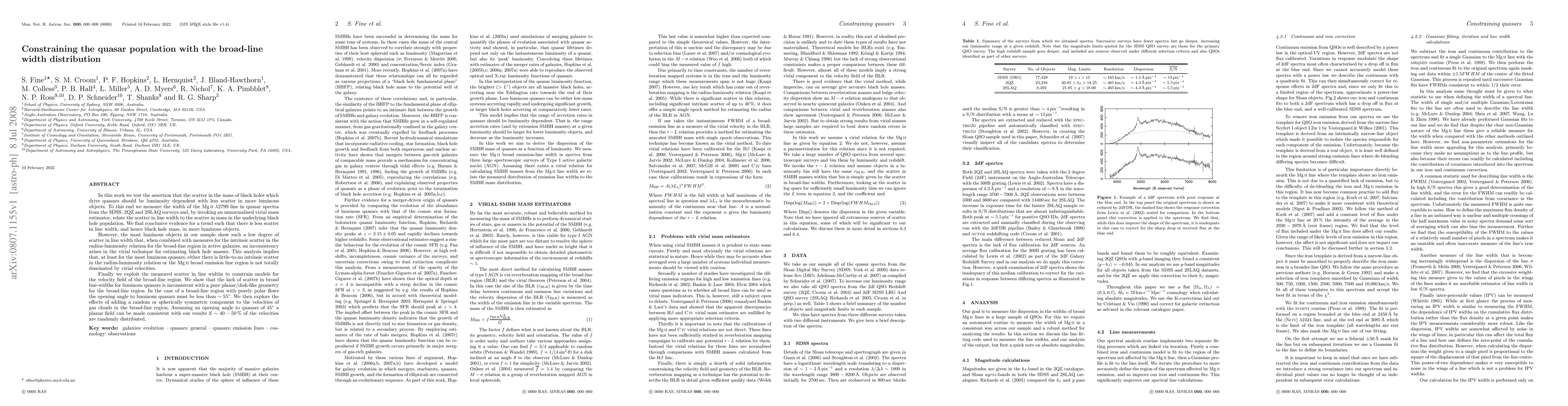 We measure the width of the MgII $\lambda2799$ line in quasar spectra from the SDSS, 2QZ and 2SLAQ surveys and, by invoking an unnormalised virial mass estimator, relate the scatter in line width to the scatter in mass in the underlying black hole population. We find conclusive evidence for a trend such that there is less scatter in line width, and hence black hole mass, in more luminous objects. However, the most luminous objects in our sample show such a low degree of scatter in line width that, when combined with measures for the intrinsic scatter in the radius-luminosity relation for the broad-line region in active galaxies, an inconsistency arises in the virial technique for estimating black hole masses. This analysis implies that, at least for the most luminous quasars, either there is little-to-no intrinsic scatter in the radius-luminosity relation or the MgII broad emission line region is not totally dominated by virial velocities. Finally we exploit the measured scatter in line widths to constrain models for the velocity field of the broad-line region. We show that the lack of scatter in broad line-widths for luminous quasars is inconsistent with a pure planar/disk-like geometry for the broad-line region... (abridged)