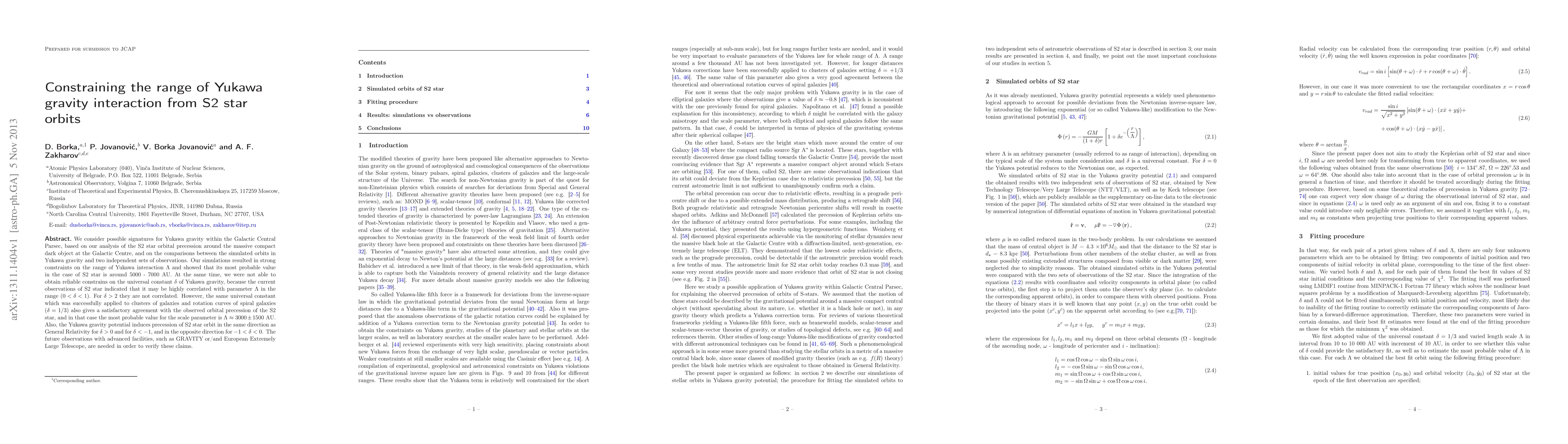 We consider possible signatures for Yukawa gravity within the Galactic Central Parsec, based on our analysis of the S2 star orbital precession around the massive compact dark object at the Galactic Centre, and on the comparisons between the simulated orbits in Yukawa gravity and two independent sets of observations. Our simulations resulted in strong constraints on the range of Yukawa interaction $\Lambda$ and showed that its most probable value in the case of S2 star is around 5000 - 7000 AU. At the same time, we were not able to obtain reliable constrains on the universal constant $\delta$ of Yukawa gravity, because the current observations of S2 star indicated that it may be highly correlated with parameter $\Lambda$ in the range $(0 <\delta < 1)$. For $\delta > 2$ they are not correlated. However, the same universal constant which was successfully applied to clusters of galaxies and rotation curves of spiral galaxies ($\delta=1/3$) also gives a satisfactory agreement with the observed orbital precession of the S2 star, and in that case the most probable value for the scale parameter is $\Lambda \approx 3000 \pm 1500$ AU. Also, the Yukawa gravity potential induces precession of S2 star orbit in the same direction as General Relativity for $\delta > 0$ and for $\delta < -1$, and in the opposite direction for $-1 <\delta < 0$. The future observations with advanced facilities, such as GRAVITY or/and European Extremely Large Telescope, are needed in order to verify these claims.