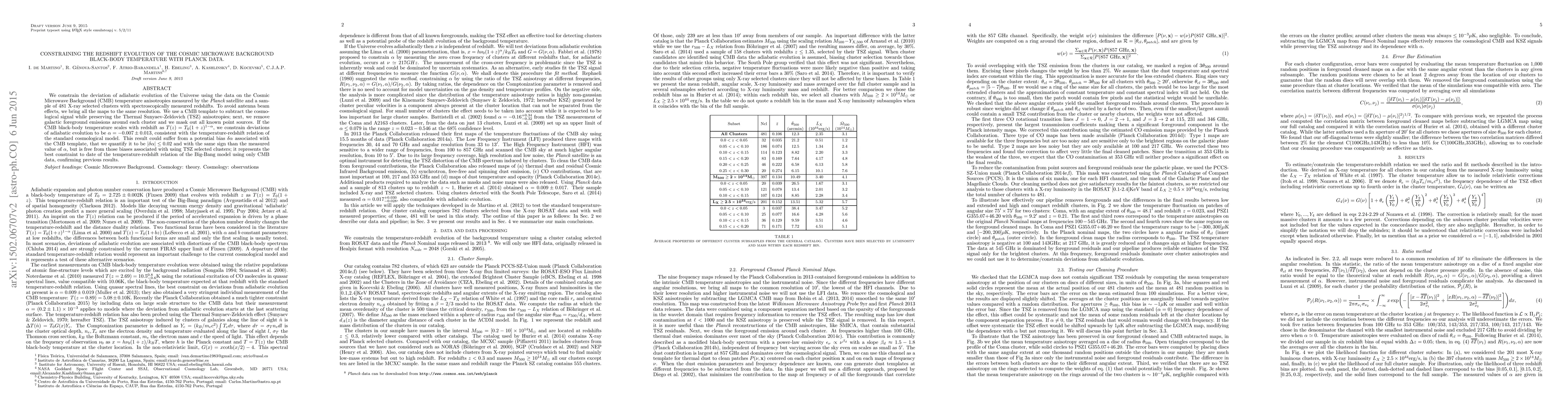 We constrain the deviation of adiabatic evolution of the Universe using the data on the Cosmic Microwave Background (CMB) temperature anisotropies measured by the {\it Planck} satellite and a sample of 481 X-ray selected clusters with spectroscopically measured redshifts. To avoid antenna beam effects, we bring all the maps to the same resolution. We use a CMB template to subtract the cosmological signal while preserving the Thermal Sunyaev-Zeldovich (TSZ) anisotropies; next, we remove galactic foreground emissions around each cluster and we mask out all known point sources. If the CMB black-body temperature scales with redshift as $T(z)=T_0(1+z)^{1-\alpha}$, we constrain deviations of adiabatic evolution to be $\alpha=-0.007\pm 0.013$, consistent with the temperature-redshift relation of the standard cosmological model. This result could suffer from a potential bias $\delta\alpha$ associated with the CMB template, that we quantify it to be $|\delta\alpha|\le 0.02$ and with the same sign than the measured value of $\alpha$, but is free from those biases associated with using TSZ selected clusters; it represents the best constraint to date of the temperature-redshift relation of the Big-Bang model using only CMB data, confirming previous results.