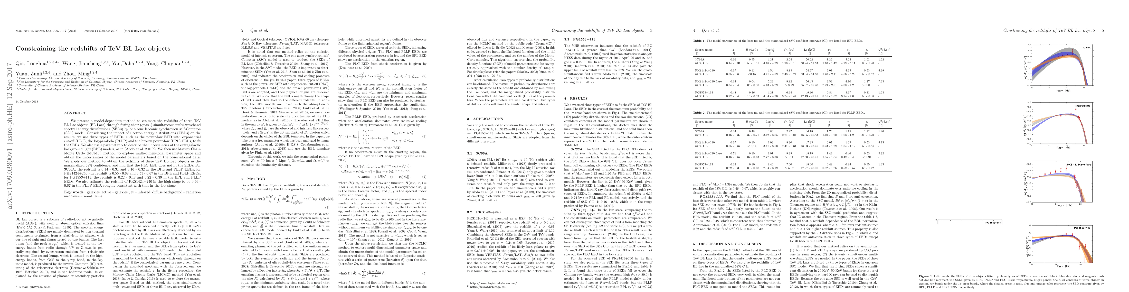 This paper presents a method to estimate the redshifts of three TeV BL Lac objects using a one-zone leptonic synchrotron self-Compton model to fit their multi-waveband spectral energy distributions. The study finds that the power-law EED does not fit the data, but the broken power-law and log-parabola EEDs provide redshift estimates for 3C66A, PKS1424+240, and PG1553+113, with results consistent across different electron energy distributions.