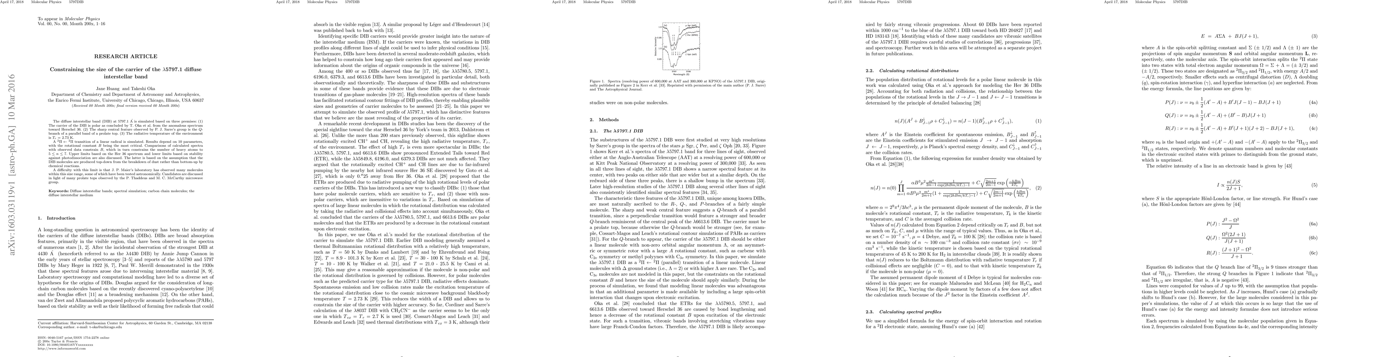 The diffuse interstellar band (DIB) at 5797.1 \AA\ is simulated based on three premises: (1) The carrier of the DIB is polar as concluded by T. Oka et al. from the anomalous spectrum toward Herschel 36. (2) The sharp central feature observed by P. J. Sarre's group is the $Q$-branch of a parallel band of a prolate top. (3) The radiative temperature of the environment is $T_r$=2.73 K. A $^2 \Pi \leftarrow$ $^2\Pi$ transition of a linear radical is simulated. Results depend on 10 parameters, with the rotational constant $B$ being the most critical. Comparisons of calculated spectra with observed data constrain $B$, which in turn constrains the number of heavy atoms to 5 $\leq n \leq 7$. Upper limits based on the Her 36 spectrum and lower limits based on stability against photodissociation are also discussed. The latter is based on the assumption that the DIB molecules are produced top-down from the breakdown of dust rather than bottom-up by chemical reactions. A difficulty with this limit is that J. P. Maier's laboratory has observed many molecules within this size range, some of which have been tested astronomically. Candidates are discussed in light of many prolate tops observed by the P. Thaddeus and M. C. McCarthy microwave group.