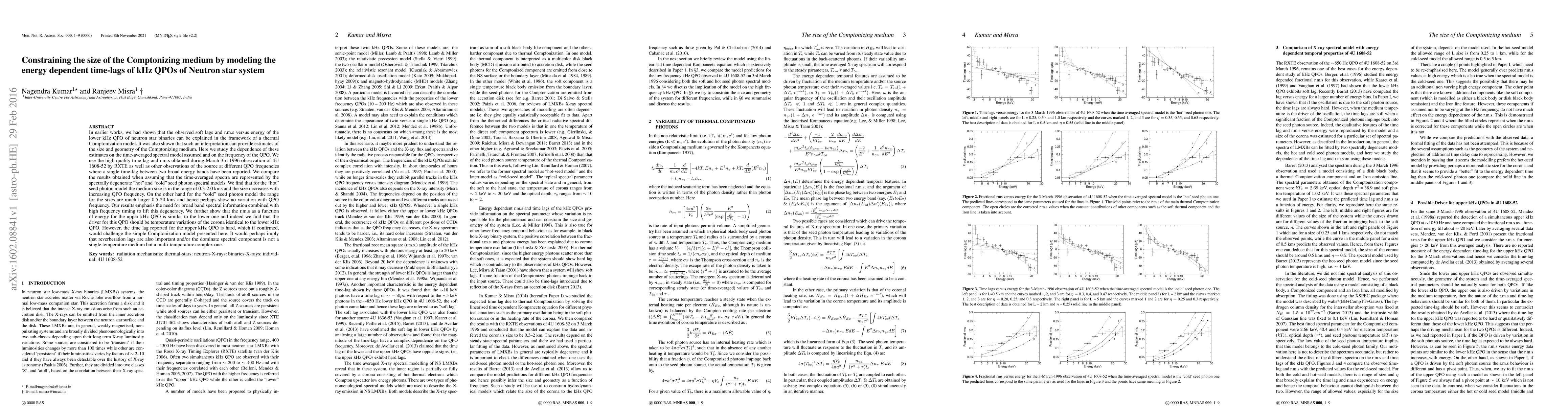 In earlier works, we had shown that the observed soft lags and r.m.s versus energy of the lower kHz QPO of neutron star binaries can be explained in the framework of a thermal Comptonization model. It was also shown that such an interpretation can provide estimates of the size and geometry of the Comptonizing medium. Here we study the dependence of these estimates on the time-averaged spectral model assumed and on the frequency of the QPO. We use the high quality time lag and r.m.s obtained during March 3rd 1996 observation of 4U 1608-52 by RXTE as well as other observations of the source at different QPO frequencies where a single time-lag between two broad energy bands have been reported. We compare the results obtained when assuming that the time-averaged spectra are represented by the spectrally degenerate "hot" and "cold" seed photon spectral models. We find that for the "hot" seed photon model the medium size is in the range of 0.3-2.0 kms and the size decreases with increasing QPO frequency. On the other hand for the "cold" seed photon model the range for the sizes are much larger 0.5-20 kms and hence perhaps show no variation with QPO frequency. Our results emphasis the need for broad band spectral information combined with high frequency timing to lift this degeneracy. We further show that the r.m.s as a function of energy for the upper kHz QPO is similar to the lower one and indeed we find that the driver for this QPO should be temperature variations of the corona identical to the lower kHz QPO. However, the time lag reported for the upper kHz QPO is hard, which if confirmed, would challenge the simple Comptonization model presented here. It would perhaps imply that reverberation lags are also important and/or the dominate spectral component is not a single temperature medium but a multi-temperature complex one.