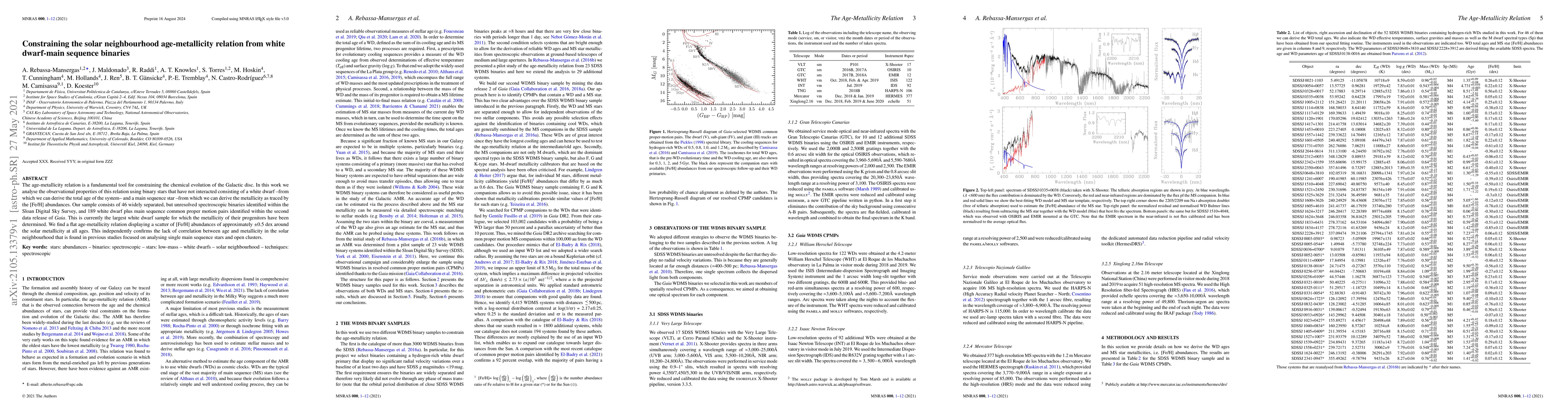 This study investigates the age-metallicity relation in the solar neighbourhood using white dwarf-main sequence binary stars, finding a flat relation with a scatter of 0.5 dex around solar metallicity, confirming previous findings of no strong correlation between age and metallicity in this region.