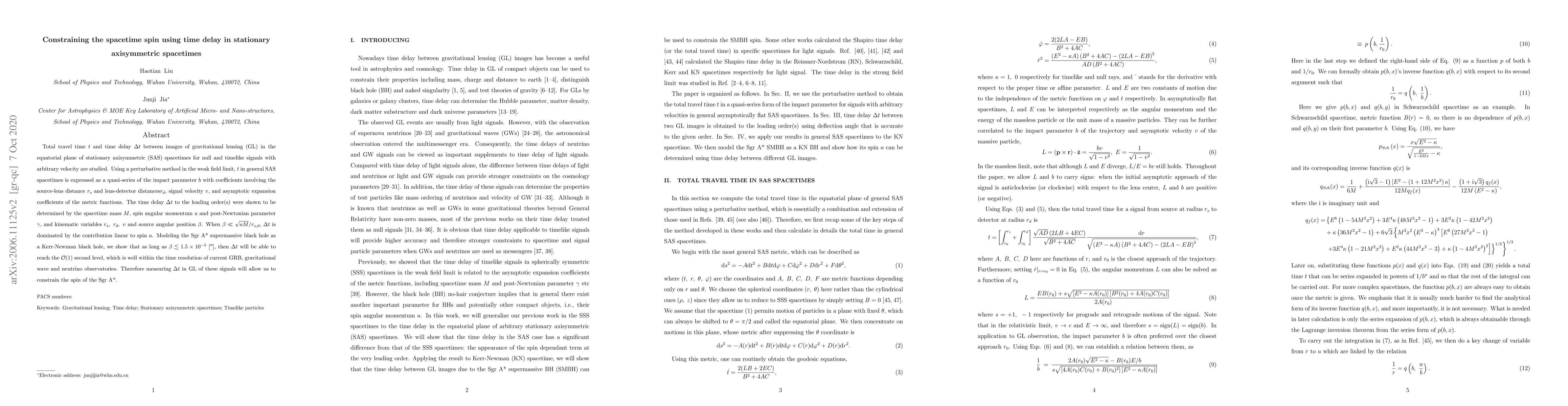 Total travel time $t$ and time delay $\Delta t$ between images of gravitational lensing (GL) in the equatorial plane of stationary axisymmetric (SAS) spacetimes for null and timelike signals with arbitrary velocity are studied. Using a perturbative method in the weak field limit, $t$ in general SAS spacetimes is expressed as a quasi-series of the impact parameter $b$ with coefficients involving the source-lens distance $r_s$ and lens-detector distances $r_d$, signal velocity $v$, and asymptotic expansion coefficients of the metric functions. The time delay $\Delta t$ to the leading order(s) were shown to be determined by the spacetime mass $M$, spin angular momentum $a$ and post-Newtonian parameter $\gamma$, and kinematic variables $r_s,~r_d,~v$ and source angular position $\beta$. When $\beta\ll \sqrt{aM}/r_{s,d}$, $\Delta t$ is dominated by the contribution linear to spin $a$. Modeling the Sgr A* supermassive black hole as a Kerr-Newman black hole, we show that as long as $\beta\lesssim 1.5\times 10^{-5}$ [$^{\prime\prime}$], then $\Delta t$ will be able to reach the $\mathcal{O}(1)$ second level, which is well within the time resolution of current GRB, gravitational wave and neutrino observatories. Therefore measuring $\Delta t$ in GL of these signals will allow us to constrain the spin of the Sgr A*.