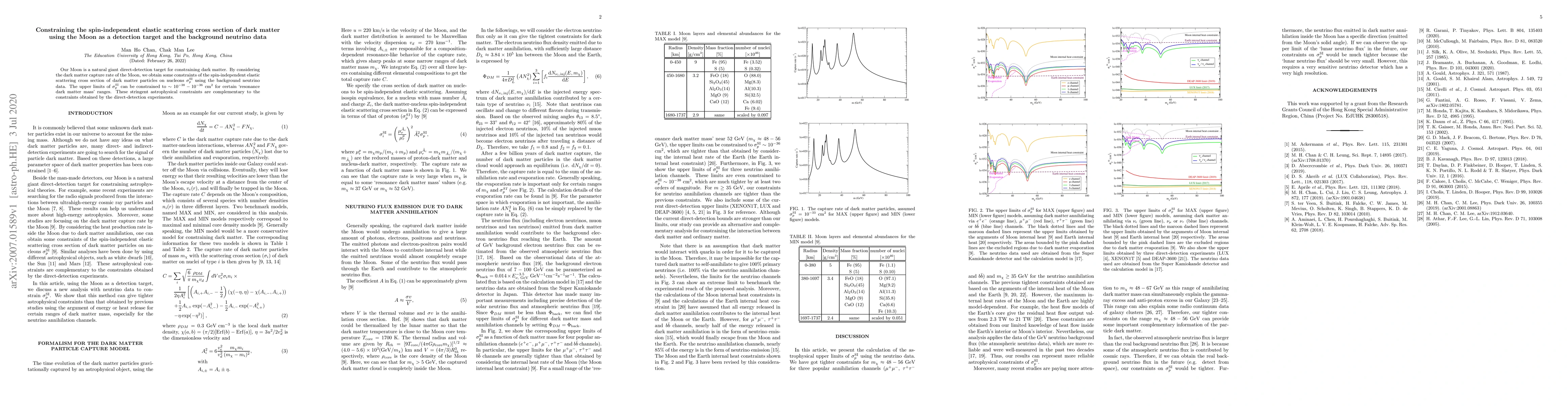 This paper constrains the spin-independent elastic scattering cross section of dark matter using the Moon as a detection target and background neutrino data. The study finds upper limits of $\sigma_p^{\rm SI}$ in the range of $10^{-38}-10^{-36}$ cm$^2$ for specific dark matter mass ranges, providing complementary constraints to direct-detection experiments.
