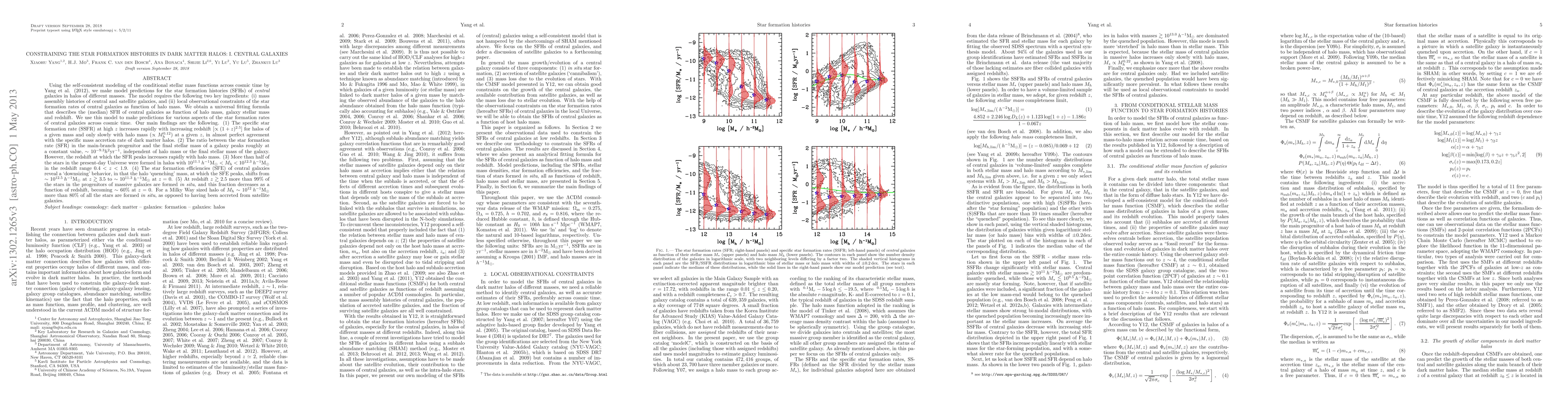 This paper models the star formation histories (SFHs) of central galaxies in dark matter halos using conditional stellar mass functions and observational constraints. Key findings include a rapid increase in specific star formation rate with redshift and a peak star formation rate ratio that is independent of halo mass.