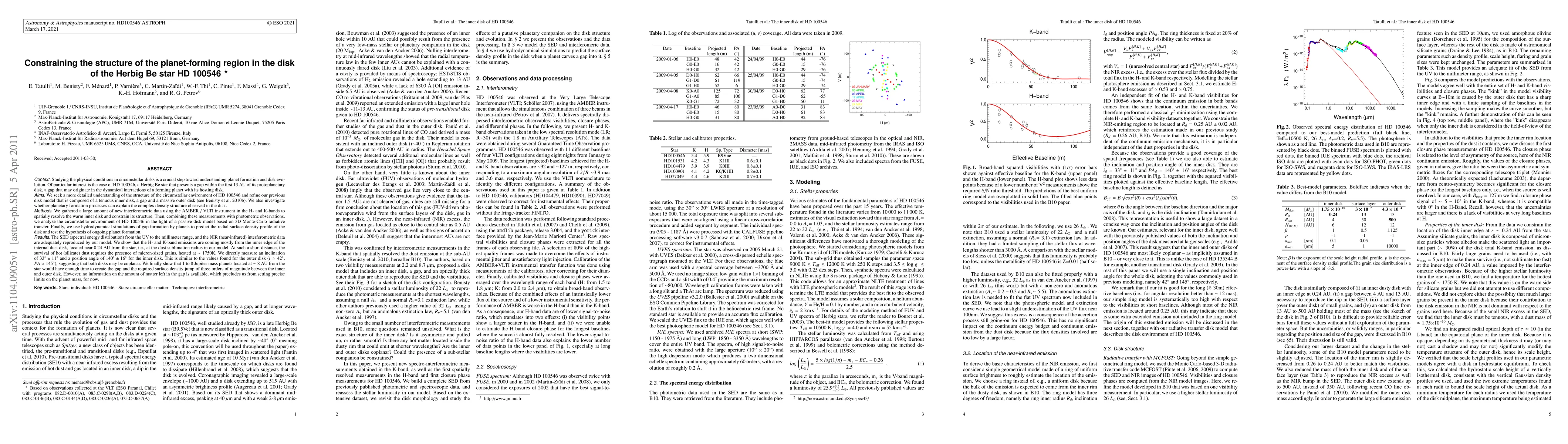 Studying the physical conditions in circumstellar disks is a crucial step toward understanding planet formation. Of particular interest is the case of HD 100546, a Herbig Be star that presents a gap within the first 13 AU of its protoplanetary disk, that may originate in the dynamical interactions of a forming planet. We gathered a large amount of new interferometric data using the AMBER/VLTI instrument in the H- and K-bands to spatially resolve the warm inner disk and constrain its structure. Then, combining these measurements with photometric observations, we analyze the circumstellar environment of HD 100546 in the light of a passive disk model based on 3D Monte-Carlo radiative transfer. Finally, we use hydrodynamical simulations of gap formation by planets to predict the radial surface density profile of the disk and test the hypothesis of ongoing planet formation. The SED and the NIR interferometric data are adequately reproduced by our model. We show that the H- and K-band emissions are coming mostly from the inner edge of the internal dust disk, located near 0.24 AU from the star, i.e., at the dust sublimation radius in our model. We directly measure an inclination of $33^{\circ} \pm 11^{\circ}$ and a position angle of $140^{\circ} \pm 16^{\circ}$ for the inner disk. This is similar to the values found for the outer disk ($i \simeq 42^{\circ}$, $PA \simeq 145^{\circ}$), suggesting that both disks may be coplanar. We finally show that 1 to 8 Jupiter mass planets located at $\sim 8$ AU from the star would have enough time to create the gap and the required surface density jump of three orders of magnitude between the inner and outer disk. However, no information on the amount of matter left in the gap is available, which precludes us from setting precise limits on the planet mass, for now.