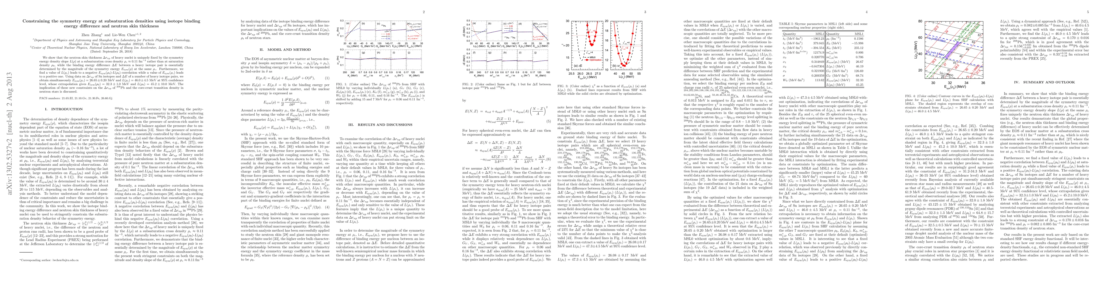 This paper constrains the symmetry energy at subsaturation densities using neutron skin thickness and isotope binding energy differences. It finds that the neutron skin thickness is determined by the symmetry energy slope at a density of 0.11 fm$^{-3}$, leading to $E_{\text{sym}}({\rho_{c}})=26.65\pm0.20$ MeV and $L({\rho_c})=46.0\pm4.5$ MeV, with implications for the core-crust transition in neutron stars.