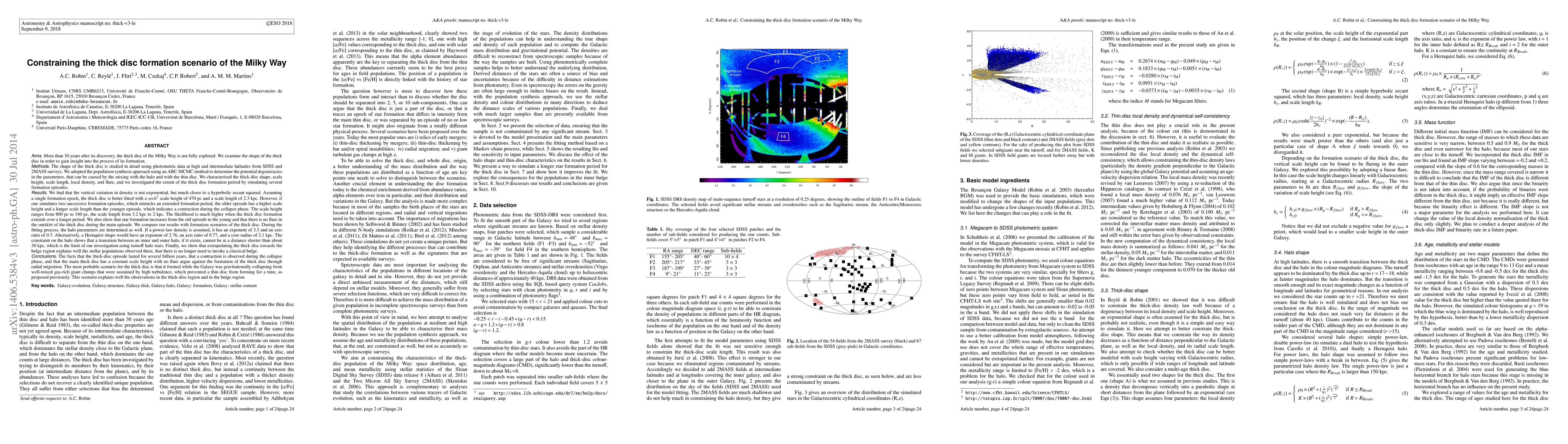 This paper uses photometric data from SDSS and 2MASS to study the thick disc of the Milky Way, finding its vertical density follows a hyperbolic secant squared profile. It suggests the thick disc formed through an extended period of two successive episodes, with a contraction during the collapse phase, and supports a scenario where the thick disc formed from collapsing gas-rich giant clumps.