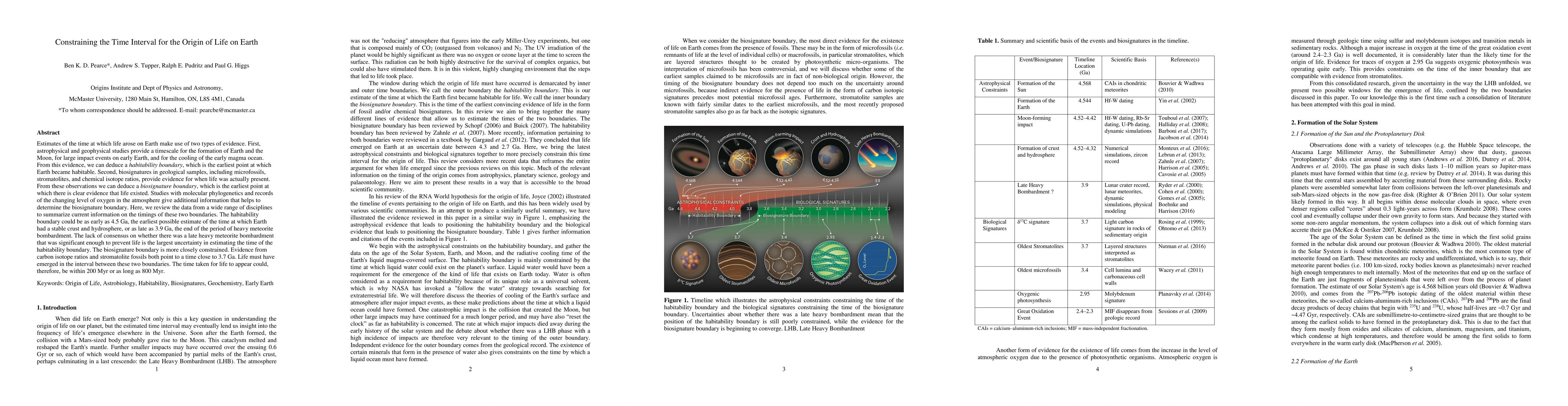 This paper reviews evidence from astrophysical, geophysical, and geological studies to determine the earliest possible times Earth could have become habitable and when life is first evidenced. The habitability boundary ranges from 4.5 to 3.9 Ga, while the biosignature boundary is closely estimated at around 3.7 Ga, suggesting life emerged between these periods, potentially within 200 to 800 million years.