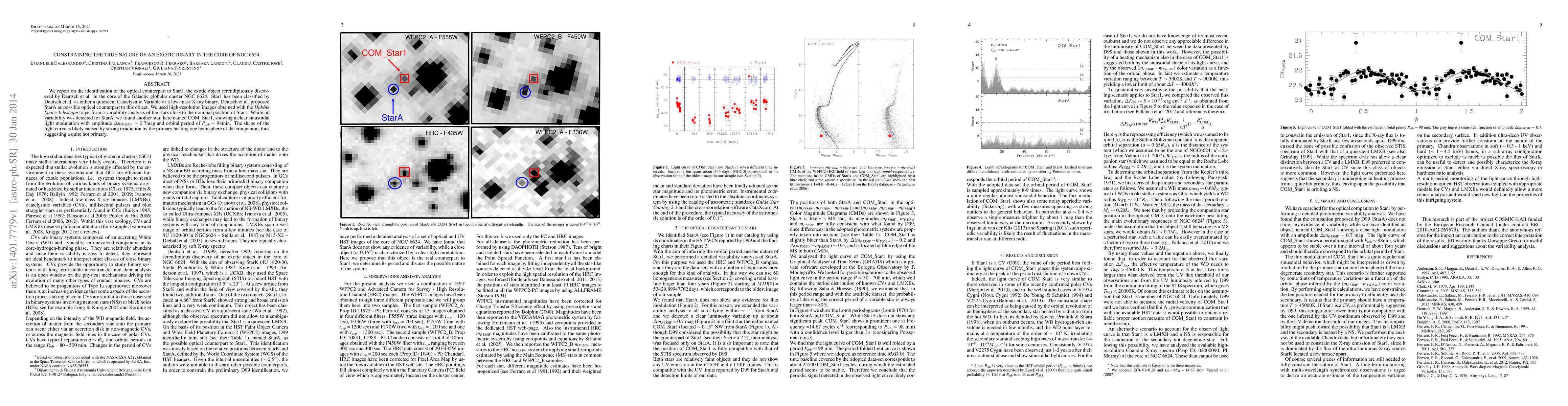 We report on the identification of the optical counterpart to Star1, the exotic object serendipitously discovered by Deutsch et al. in the core of the Galactic globular cluster NGC 6624. Star1 has been classified by Deutsch et al. as either a quiescent Cataclysmic Variable or a low-mass X-ray binary. Deutsch et al. proposed StarA as possible optical counterpart to this object. We used high-resolution images obtained with the Hubble Space Telescope to perform a variability analysis of the stars close to the nominal position of Star1. While no variability was detected for StarA, we found another star, here named COM_Star1, showing a clear sinusoidal light modulation with amplitude \Delta m_F435W~0.7 mag and orbital period of P_orb~98 min. The shape of the light curve is likely caused by strong irradiation by the primary heating one hemisphere of the companion, thus suggesting a quite hot primary.