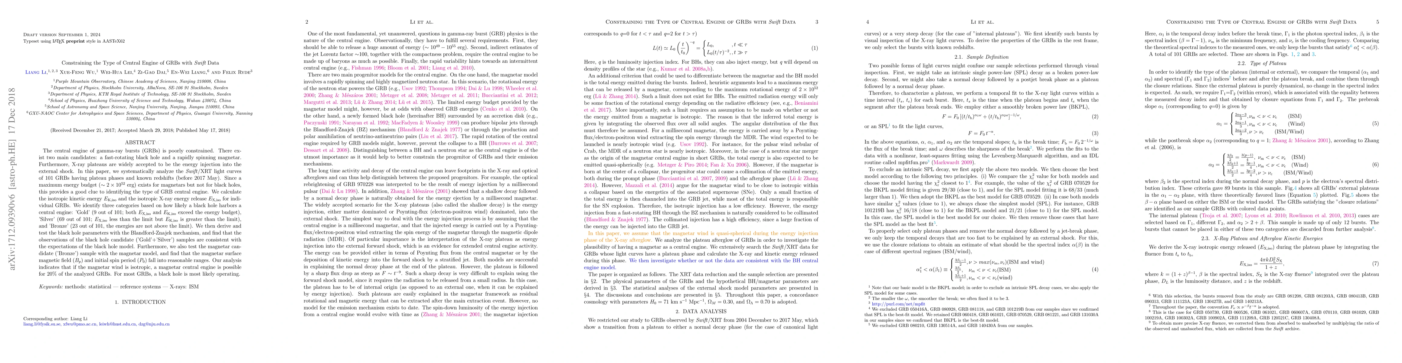 This paper analyzes Swift/XRT light curves of 101 GRBs to determine the type of central engine, categorizing them into 'Gold', 'Silver', and 'Bronze' based on energy budgets. The results suggest that a black hole is the most likely engine for most GRBs, while a magnetar could be responsible for about 20% of them.