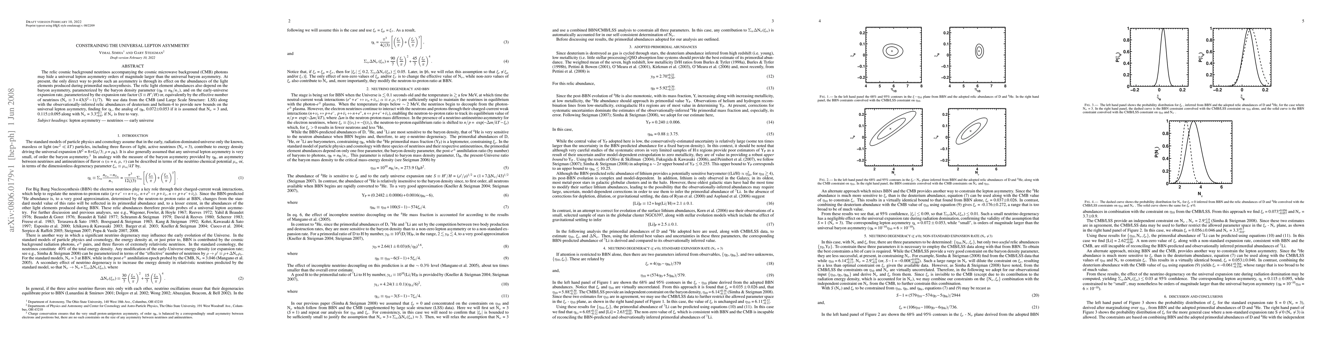 This paper constrains the universal lepton asymmetry using the relic cosmic background neutrinos and primordial nucleosynthesis light element abundances. It finds a lepton asymmetry parameter eta_L of 0.072 +/- 0.053 when assuming a fixed effective number of neutrinos, and 0.115 +/- 0.095 with a variable effective number of neutrinos.