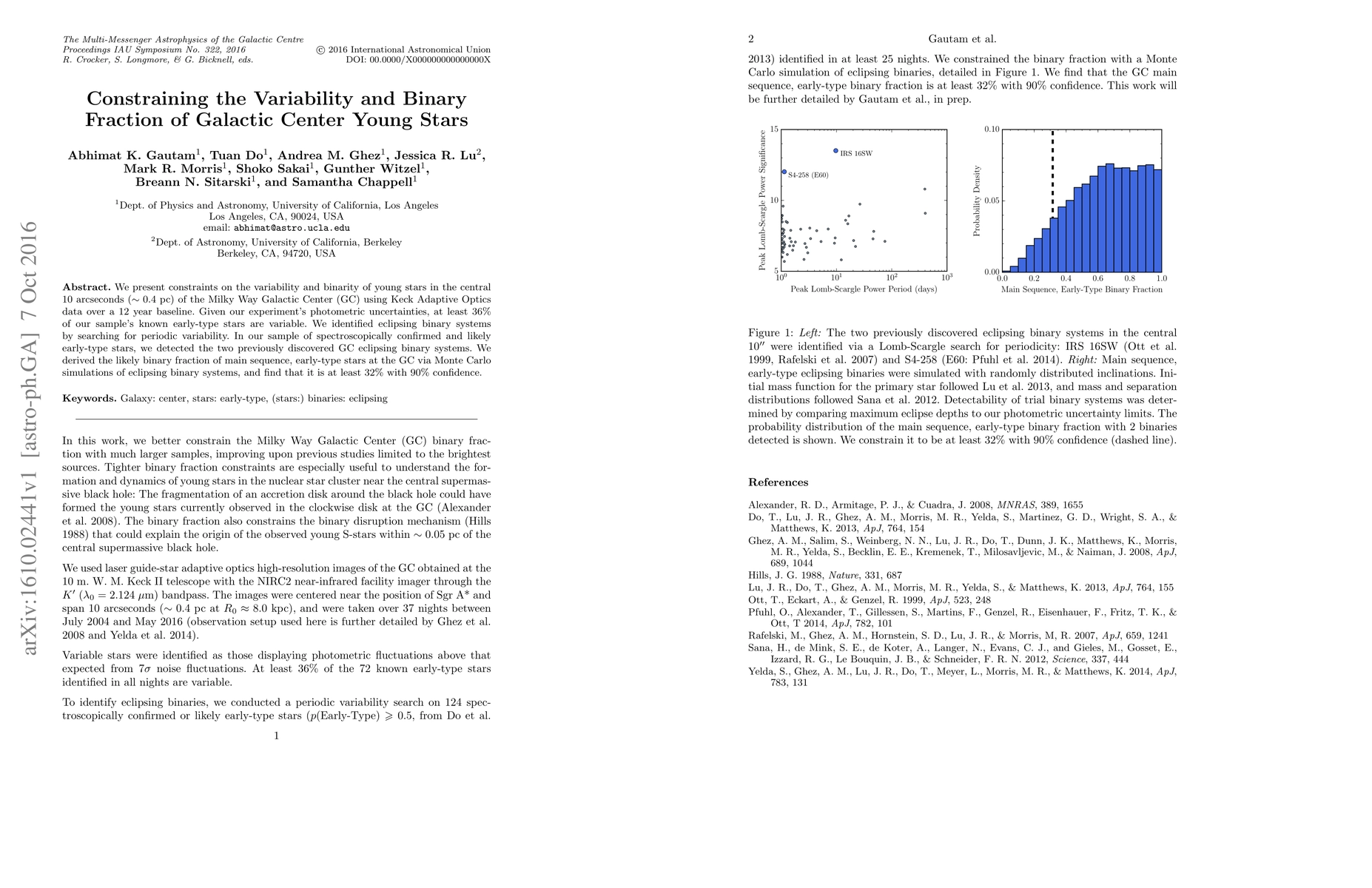 We present constraints on the variability and binarity of young stars in the central 10 arcseconds (~0.4 pc) of the Milky Way Galactic Center (GC) using Keck Adaptive Optics data over a 12 year baseline. Given our experiment's photometric uncertainties, at least 36% of our sample's known early-type stars are variable. We identified eclipsing binary systems by searching for periodic variability. In our sample of spectroscopically confirmed and likely early-type stars, we detected the two previously discovered GC eclipsing binary systems. We derived the likely binary fraction of main sequence, early-type stars at the GC via Monte Carlo simulations of eclipsing binary systems, and find that it is at least 32% with 90% confidence.