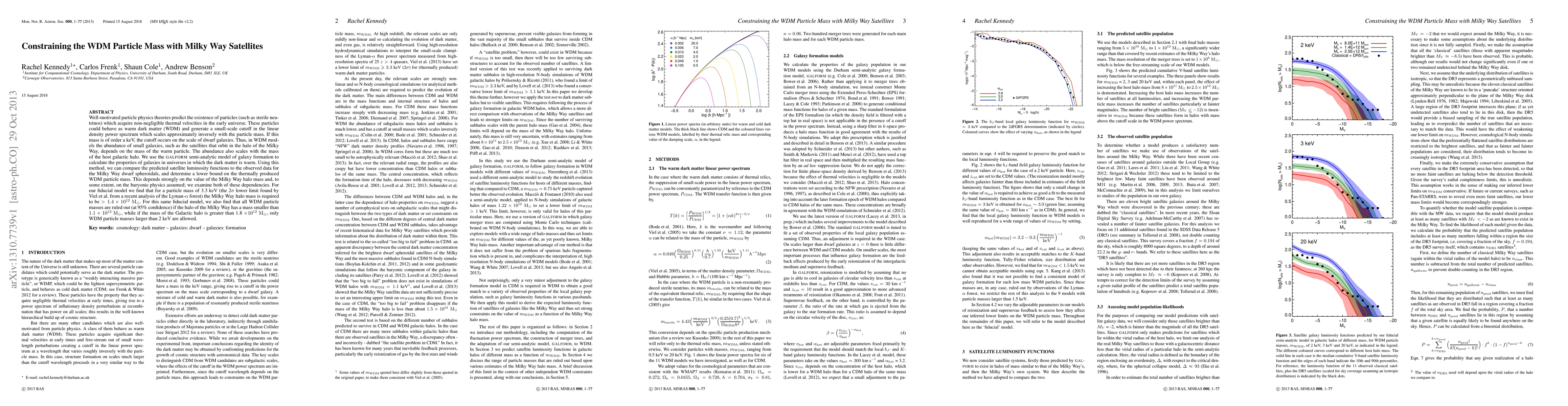 This paper uses the \galform semi-analytic model to study the impact of warm dark matter (WDM) particles on the Milky Way's satellite galaxies, determining a lower bound for the WDM particle mass by comparing predicted satellite luminosity functions with observed data. The analysis finds that a WDM particle mass of 3.3 keV requires a Milky Way halo mass greater than $1.4 \times 10^{12}$ \msun.
