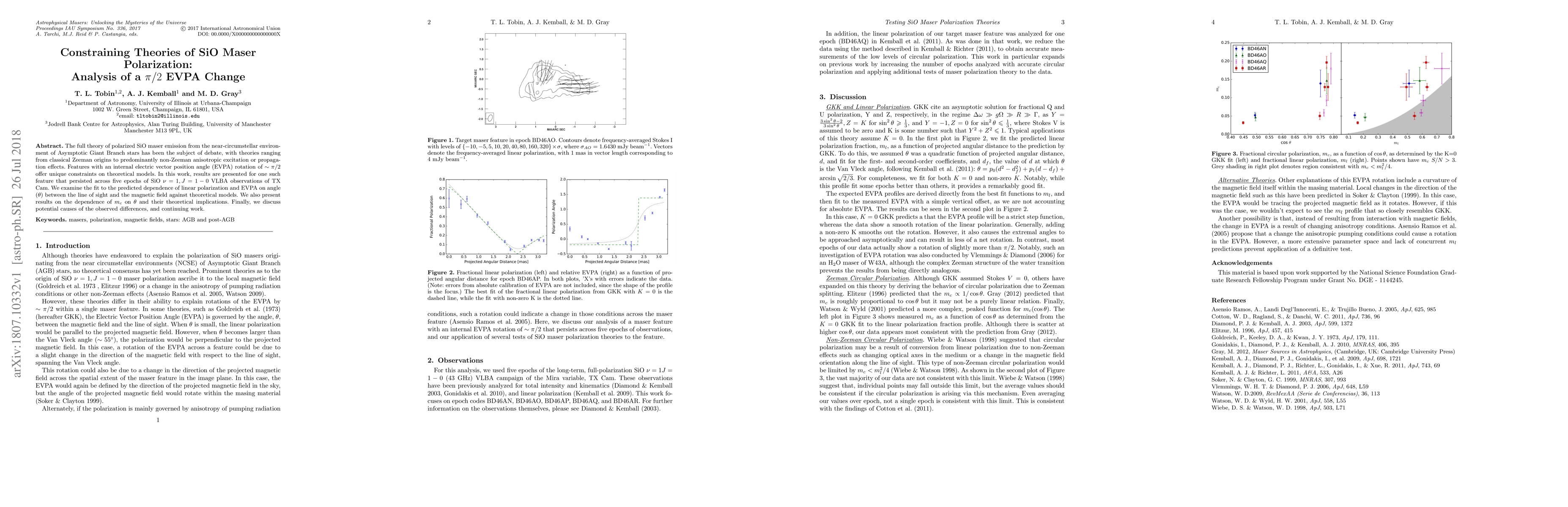 Researchers analyze polarization patterns in a specific maser feature to constrain theories of SiO emission from Asymptotic Giant Branch stars, finding unique constraints on magnetic field angle and its effects.