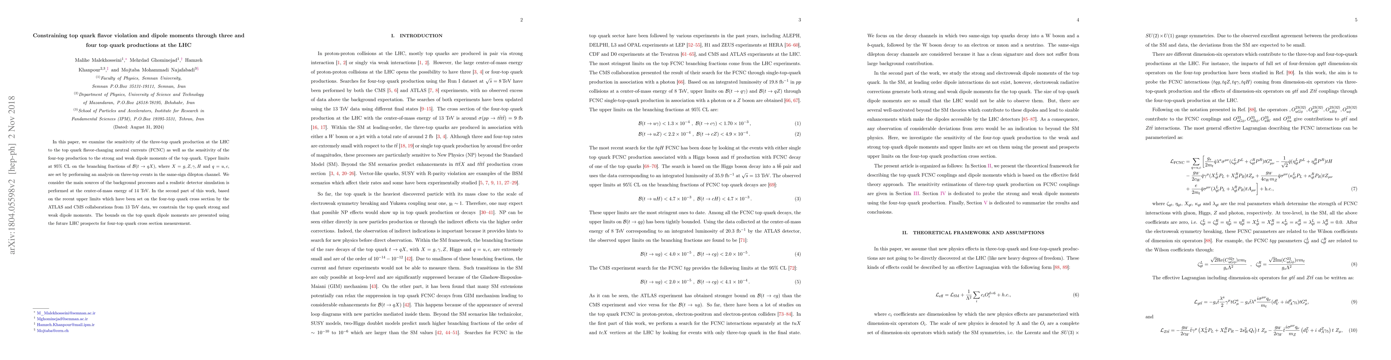 This paper investigates the sensitivity of three-top quark production at the LHC to top quark flavor-changing neutral currents and four-top quark production to its dipole moments. It sets upper limits on branching fractions and constrains dipole moments using data from the same-sign dilepton channel and recent LHC measurements.