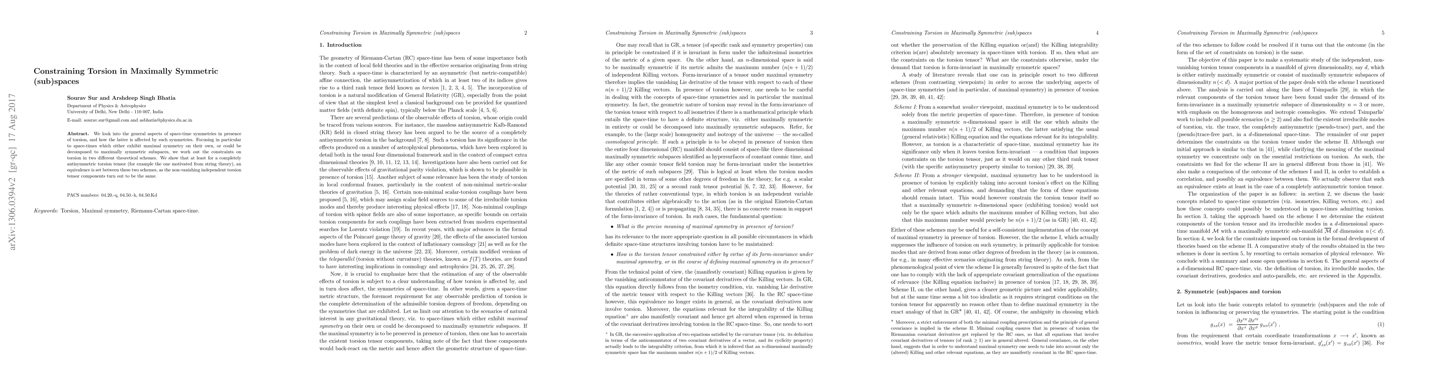 We look into the general aspects of space-time symmetries in presence of torsion, and how the latter is affected by such symmetries. Focusing in particular to space-times which either exhibit maximal symmetry on their own, or could be decomposed to maximally symmetric subspaces, we work out the constraints on torsion in two different theoretical schemes. We show that at least for a completely antisymmetric torsion tensor (for e.g. the one motivated from string theory), an equivalence is set between these two schemes, as the non-vanishing independent torsion tensor components turn out to be the same.