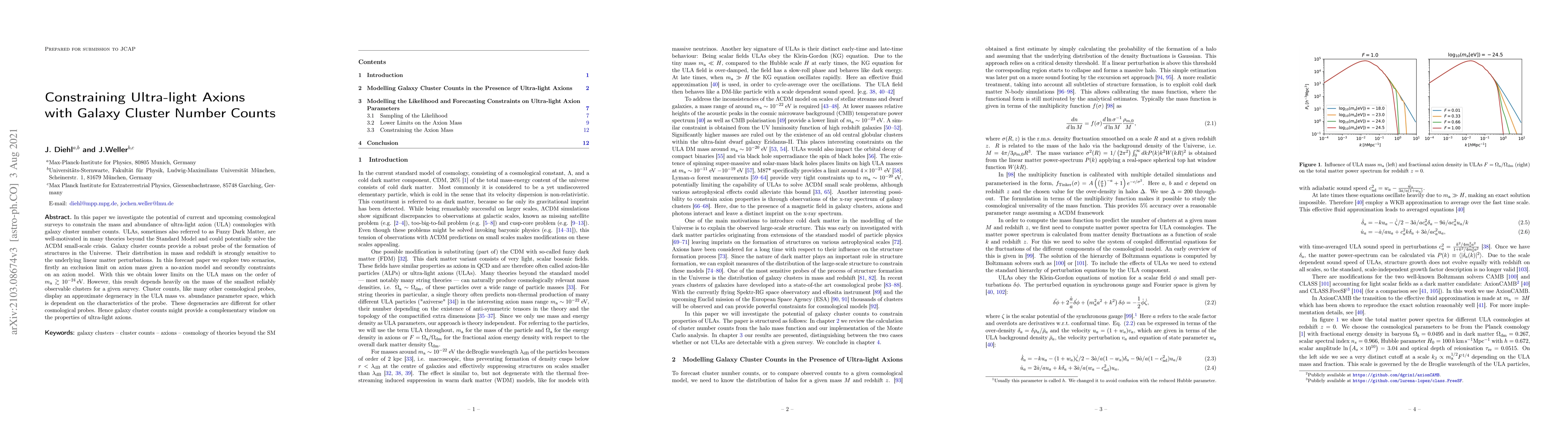 This paper explores how galaxy cluster number counts can constrain ultra-light axion masses, finding lower limits on the axion mass of $m_a \gtrsim 10^{-24}$ eV, and suggests that cluster counts may offer a complementary perspective on axion properties due to degeneracies with other cosmological probes.