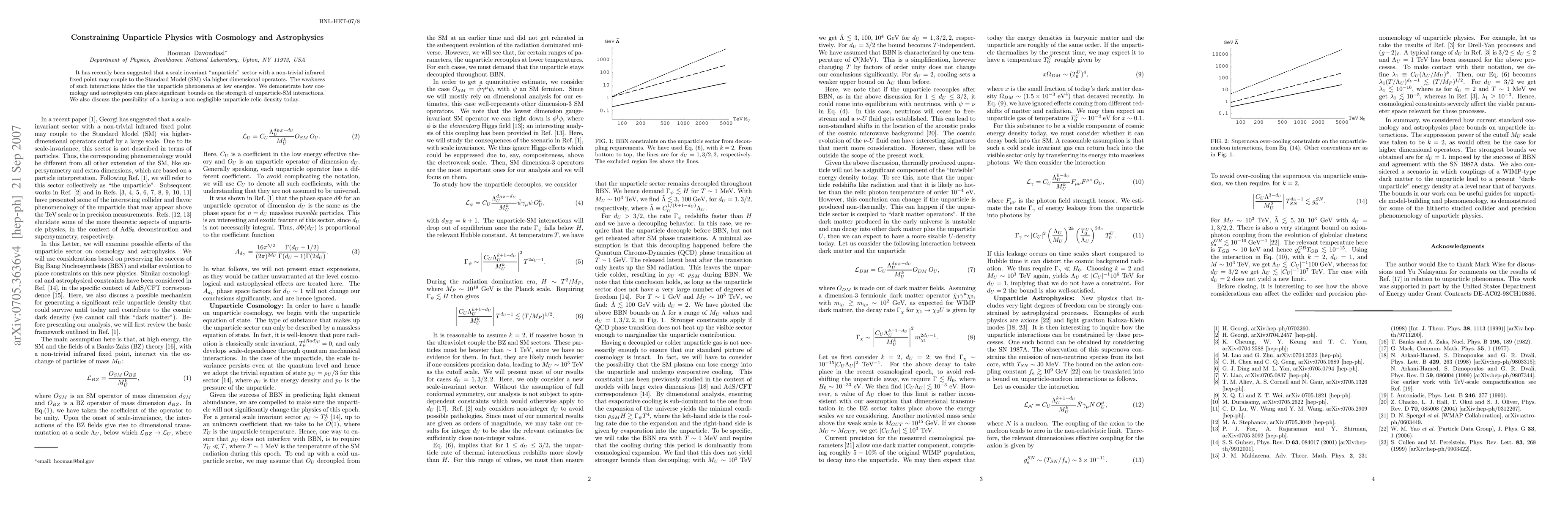 This paper explores the implications of unparticle physics, a hypothesized scale-invariant sector, on cosmology and astrophysics. It examines how interactions between unparticles and the Standard Model can be constrained through cosmological observations and astrophysical phenomena, including the potential for unparticles to contribute to the current relic density.