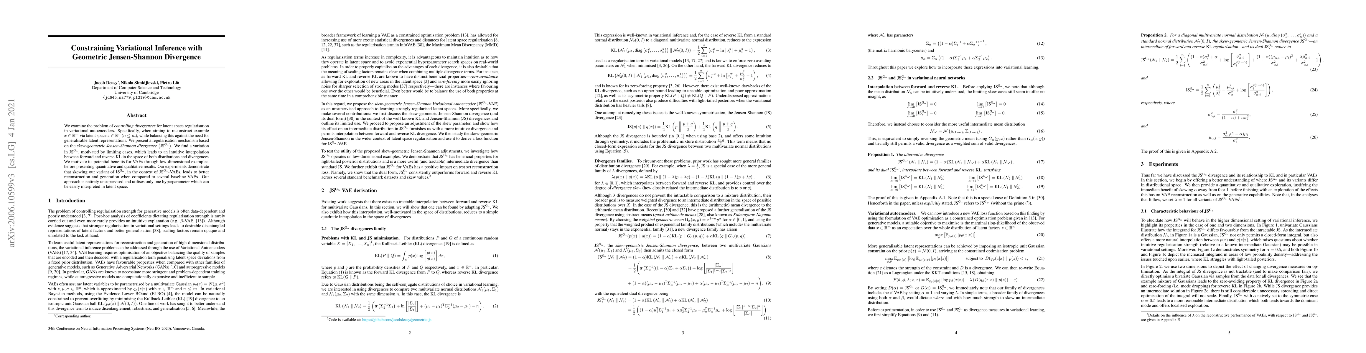 We examine the problem of controlling divergences for latent space regularisation in variational autoencoders. Specifically, when aiming to reconstruct example $x\in\mathbb{R}^{m}$ via latent space $z\in\mathbb{R}^{n}$ ($n\leq m$), while balancing this against the need for generalisable latent representations. We present a regularisation mechanism based on the skew-geometric Jensen-Shannon divergence $\left(\textrm{JS}^{\textrm{G}_{\alpha}}\right)$. We find a variation in $\textrm{JS}^{\textrm{G}_{\alpha}}$, motivated by limiting cases, which leads to an intuitive interpolation between forward and reverse KL in the space of both distributions and divergences. We motivate its potential benefits for VAEs through low-dimensional examples, before presenting quantitative and qualitative results. Our experiments demonstrate that skewing our variant of $\textrm{JS}^{\textrm{G}_{\alpha}}$, in the context of $\textrm{JS}^{\textrm{G}_{\alpha}}$-VAEs, leads to better reconstruction and generation when compared to several baseline VAEs. Our approach is entirely unsupervised and utilises only one hyperparameter which can be easily interpreted in latent space.