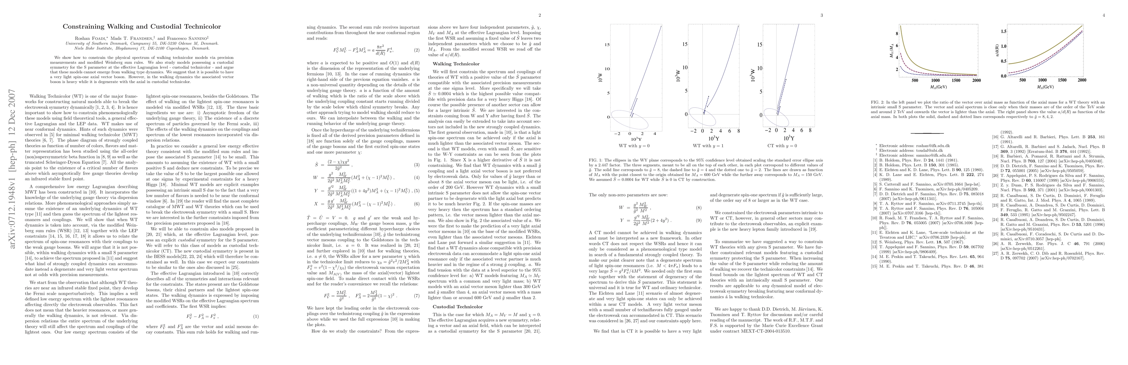 We show how to constrain the physical spectrum of walking technicolor models via precision measurements and modified Weinberg sum rules. We also study models possessing a custodial symmetry for the S parameter at the effective Lagrangian level - custodial technicolor - and argue that these models cannot emerge from walking type dynamics. We suggest that it is possible to have a very light spin-one axial vector boson. However, in the walking dynamics the associated vector boson is heavy while it is degenerate with the axial in custodial technicolor.
