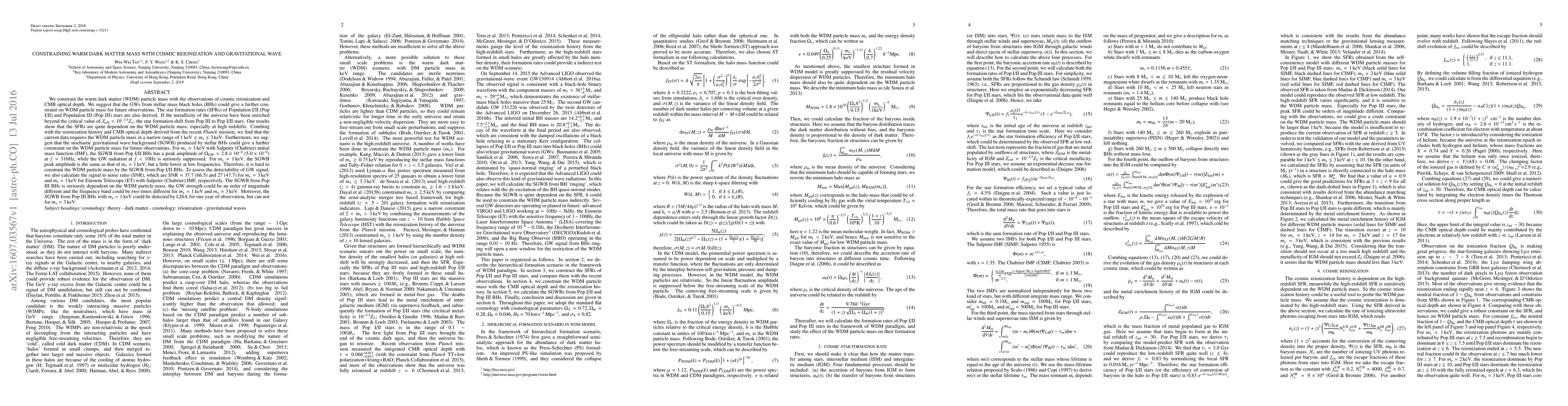 Researchers constrain warm dark matter particle mass using cosmic reionization and CMB data, finding a narrow range of $1 < m_x < 3$ keV, with stellar gravitational wave background offering further constraints for future observations.