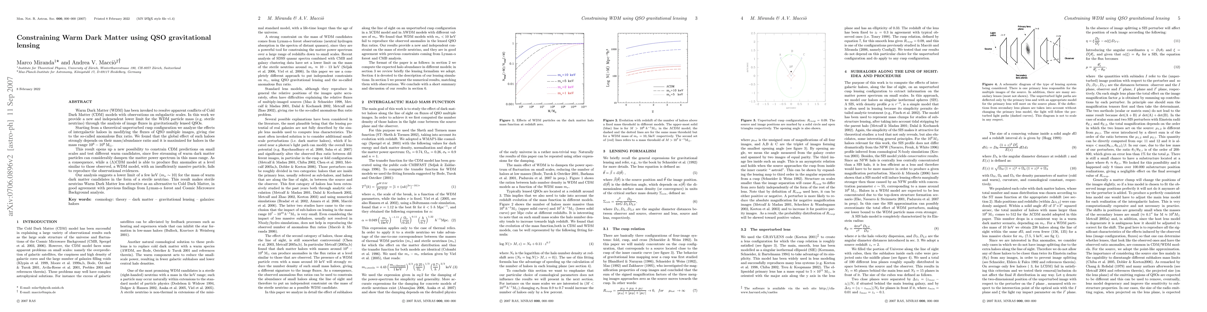 This paper constrains Warm Dark Matter (WDM) particle mass through gravitational lensing of QSOs, finding that WDM particles must be at least a few keV to match observed flux anomalies. This suggests a lower limit of $m_{\nu} \sim 10$ keV for sterile neutrino WDM candidates, making them less attractive compared to Cold Dark Matter models.