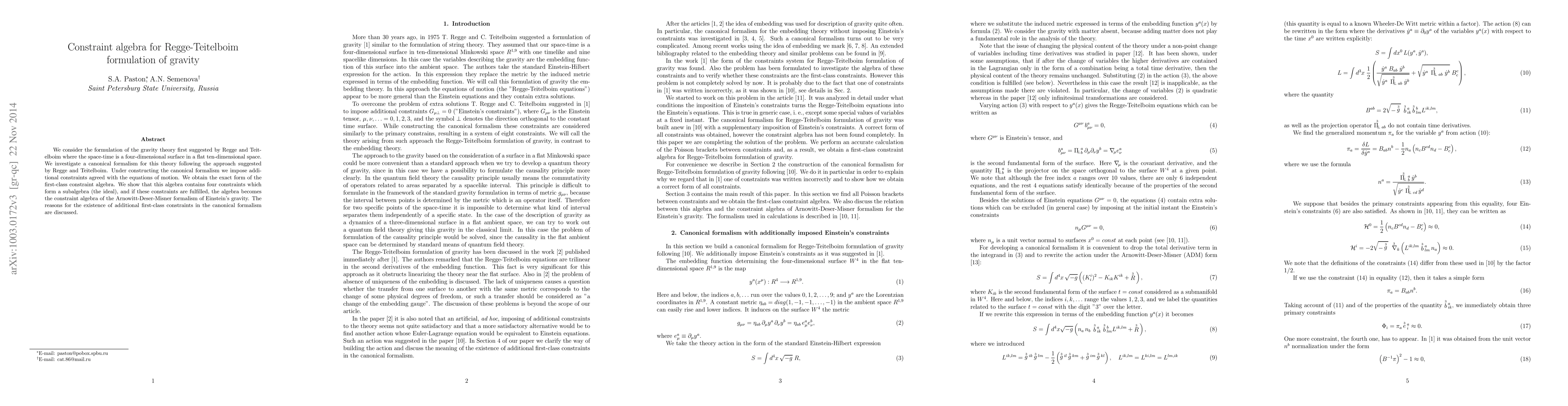 We consider the formulation of the gravity theory first suggested by Regge and Teitelboim where the space-time is a four-dimensional surface in a flat ten-dimensional space. We investigate a canonical formalism for this theory following the approach suggested by Regge and Teitelboim. Under constructing the canonical formalism we impose additional constraints agreed with the equations of motion. We obtain the exact form of the first-class constraint algebra. We show that this algebra contains four constraints which form a subalgebra (the ideal), and if these constraints are fulfilled, the algebra becomes the constraint algebra of the Arnowitt-Deser-Misner formalism of Einstein's gravity. The reasons for the existence of additional first-class constraints in the canonical formalism are discussed.
