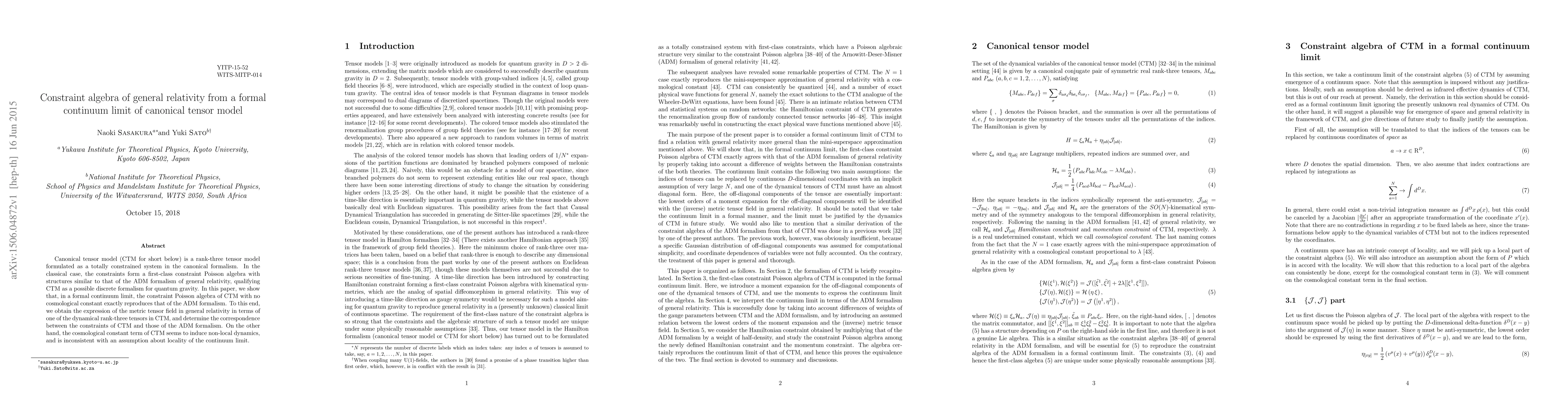 This paper demonstrates that the constraint algebra of the canonical tensor model (CTM) in a formal continuum limit matches the ADM formalism of general relativity, establishing a potential discrete framework for quantum gravity. However, the cosmological constant term in CTM introduces non-local dynamics, conflicting with the assumption of locality in the continuum limit.