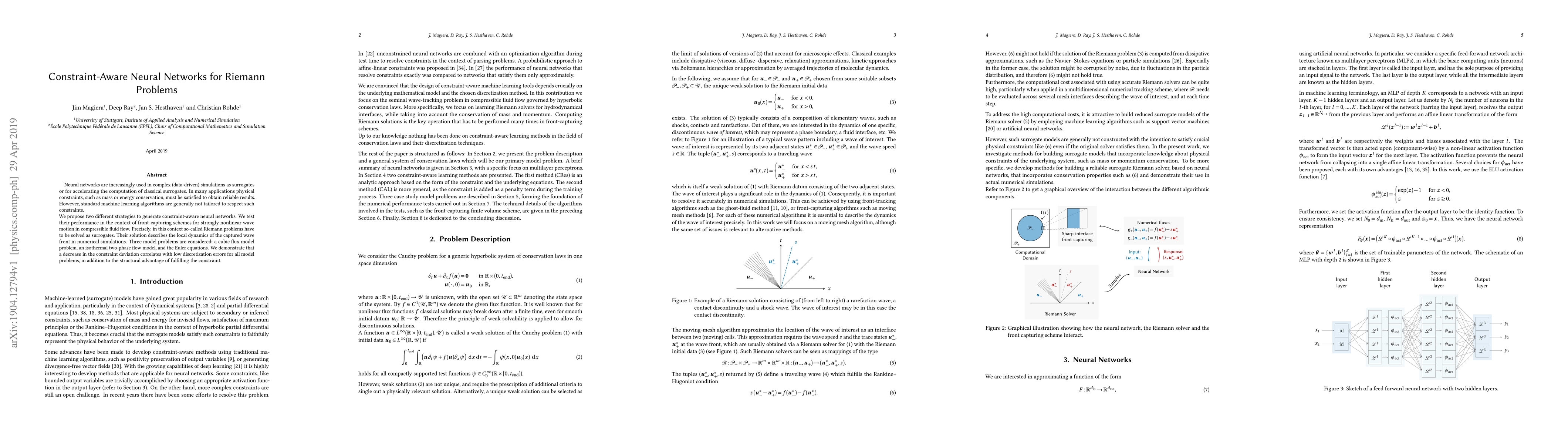 Neural networks are increasingly used in complex (data-driven) simulations as surrogates or for accelerating the computation of classical surrogates. In many applications physical constraints, such as mass or energy conservation, must be satisfied to obtain reliable results. However, standard machine learning algorithms are generally not tailored to respect such constraints. We propose two different strategies to generate constraint-aware neural networks. We test their performance in the context of front-capturing schemes for strongly nonlinear wave motion in compressible fluid flow. Precisely, in this context so-called Riemann problems have to be solved as surrogates. Their solution describes the local dynamics of the captured wave front in numerical simulations. Three model problems are considered: a cubic flux model problem, an isothermal two-phase flow model, and the Euler equations. We demonstrate that a decrease in the constraint deviation correlates with low discretization errors for all model problems, in addition to the structural advantage of fulfilling the constraint.