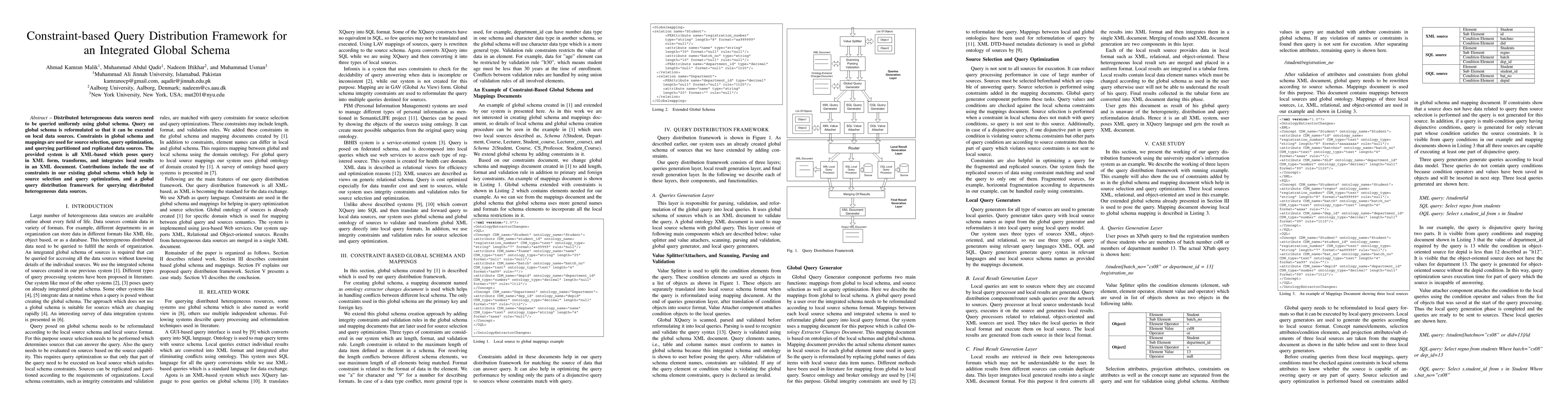 This paper proposes a constraint-based framework for query distribution across distributed heterogeneous data sources using a global schema. It reformulates global queries for local execution, optimizes queries using schema constraints, and integrates results in XML format.