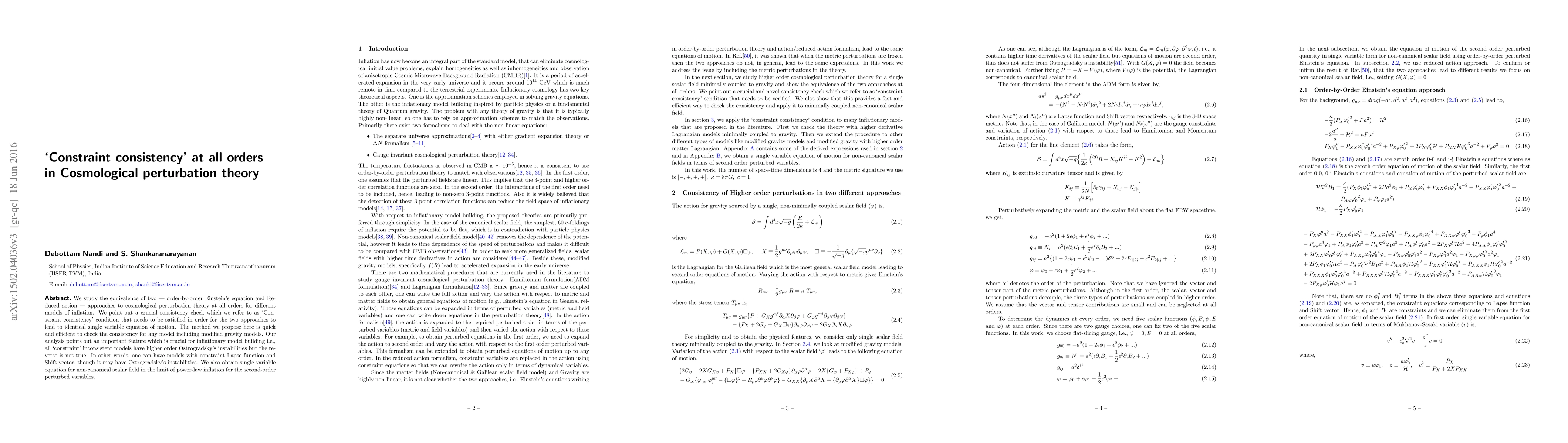 We study the equivalence of two - order-by-order Einstein's equation and Reduced action - approaches to cosmological perturbation theory at all orders for different models of inflation. We point out a crucial consistency check which we refer to as 'Constraint consistency' that needs to be satisfied. We propose a quick and efficient method to check the consistency for any model including modified gravity models. Our analysis points out an important feature which is crucial for inflationary model building i.e., all `constraint' inconsistent models have higher order Ostrogradsky's instabilities but the reverse is not true. In other words, one can have models with constraint lapse function and shift vector, though it may have Ostrogradsky's instabilities. We also obtain the single variable equation for non-canonical scalar field in the limit of power-law inflation for the second-order perturbed variables.