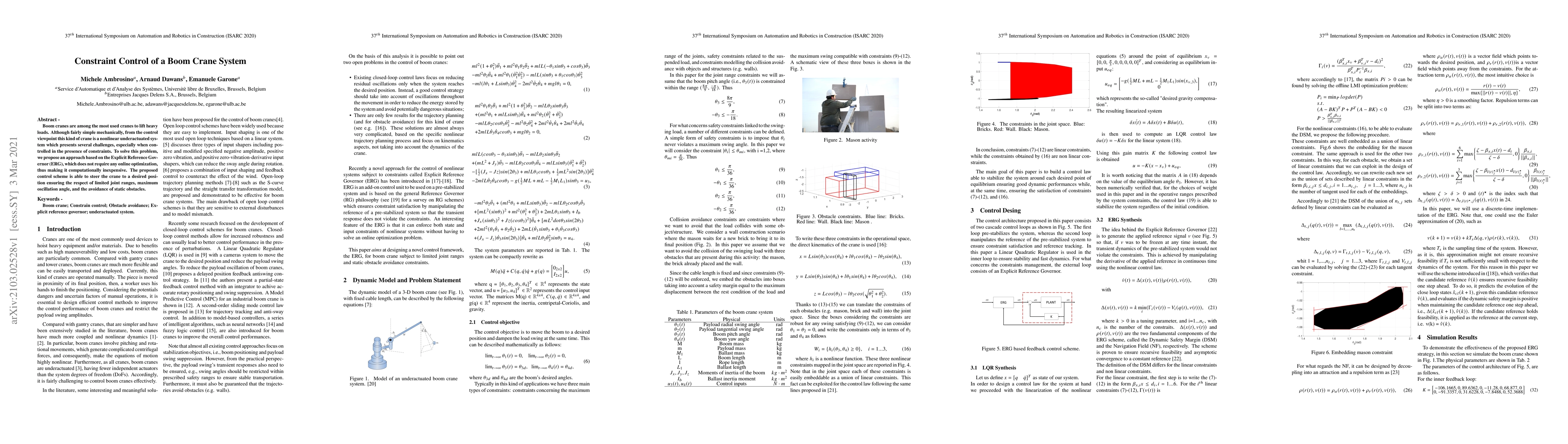 Boom cranes are among the most used cranes to lift heavy loads. Although fairly simple mechanically, from the control viewpoint this kind of crane is a nonlinear underactuated system which presents several challenges, especially when con-trolled in the presence of constraints. To solve this problem, we propose an approach based on the Explicit Reference Governor (ERG), which does not require any online optimization, thus making it computationally inexpensive. The proposed control scheme is able to steer the crane to a desired position ensuring the respect of limited joint ranges, maximum oscillation angle, and the avoidance of static obstacles.