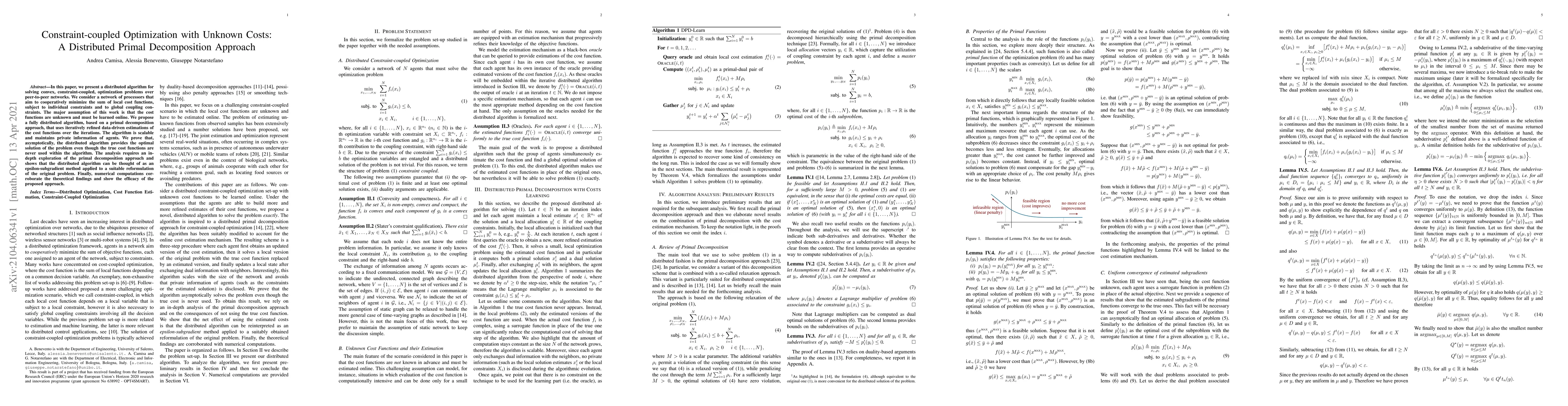 In this paper, we present a distributed algorithm for solving convex, constraint-coupled, optimization problems over peer-to-peer networks. We consider a network of processors that aim to cooperatively minimize the sum of local cost functions, subject to individual constraints and to global coupling constraints. The major assumption of this work is that the cost functions are unknown and must be learned online. We propose a fully distributed algorithm, based on a primal decomposition approach, that uses iteratively refined data-driven estimations of the cost functions over the iterations. The algorithm is scalable and maintains private information of agents. We prove that, asymptotically, the distributed algorithm provides the optimal solution of the problem even though the true cost functions are never used within the algorithm. The analysis requires an in-depth exploration of the primal decomposition approach and shows that the distributed algorithm can be thought of as an epsilon-subgradient method applied to a suitable reformulation of the original problem. Finally, numerical computations cor- roborate the theoretical findings and show the efficacy of the proposed approach.